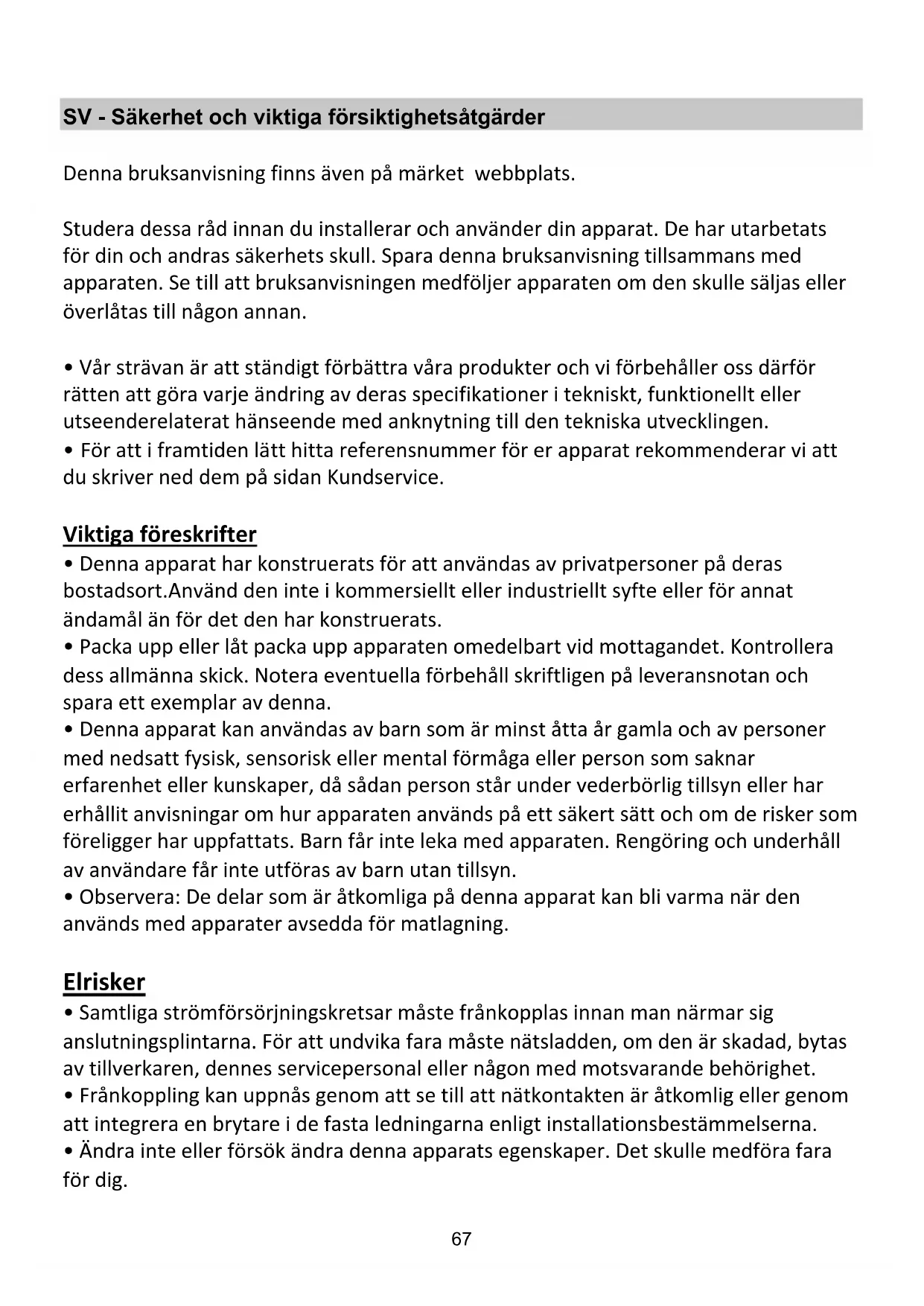 - Observera: De delar som är åtkomliga på denna apparat kan bli varma när den används med apparater avsedda för matlagning. Elrisker