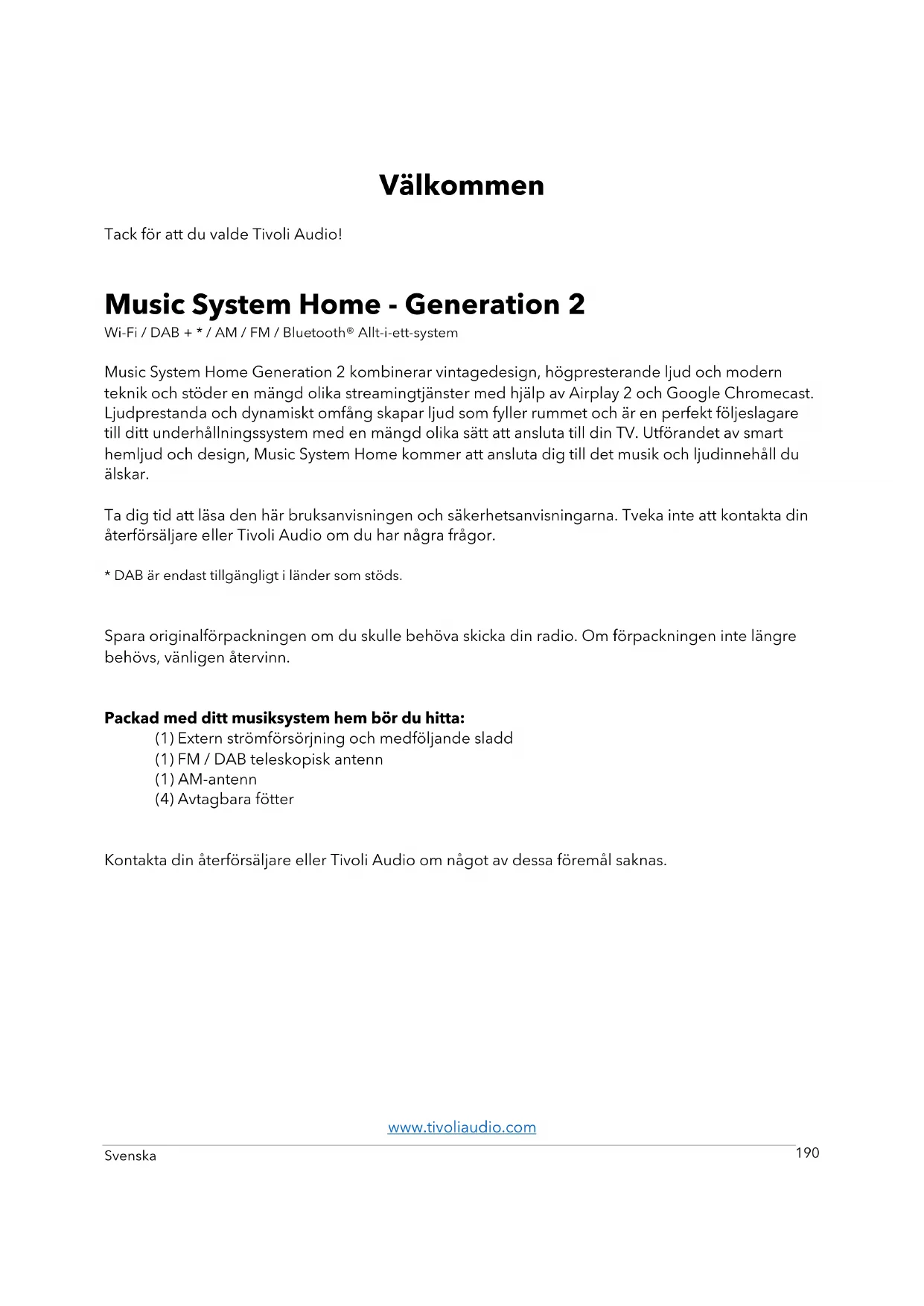 Music System Home - Generation 2 Wi-Fi / DAB + * / AM / FM / Bluetooth® Allt-i-ett-system Music System Home Generation 2 kombinerar vintagedesign, högpresterande ljud och modern teknik och stöder en mängd olika streamingtjänster med hjälp av Airplay 2 och Google Chromecast. Ljudprestanda och dynamiskt omfång skapar ljud som fyller rummet och är en perfekt följeslagare till ditt underhållningssystem med en mängd olika sätt att ansluta till din TV. Utförandet av smart hemljud och design, Music System Home kommer att ansluta dig till det musik och ljudinnehåll du älskar. Ta dig tid att läsa den här bruksanvisningen och säkerhetsanvisningarna. Tveka inte att kontakta din återförsäljare eller Tivoli Audio om du har några frågor.