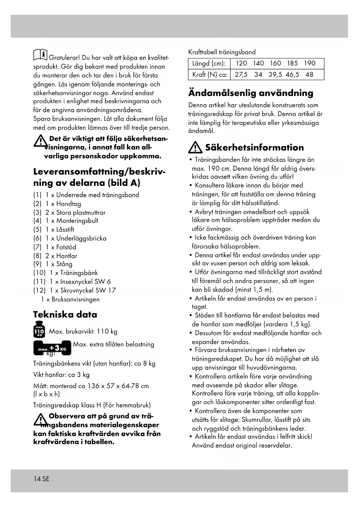 Max. brukarvikt: 110 kg Max. extra tillåten belastning 3 kg! Träningsbänkens vikt (utan hantlar): ca 8 kg Vikt hantlar: ca 3 kg Mått: monterad ca 136 x 57 x 64-78 cm (l x b x h) Träningsredskap klass H (För hemmabruk) Observera att på grund av trä- ningsbandens materialegenskaper kan faktiska kraftvärden avvika från kraftvärdena i tabellen. Krafttabell träningsband Längd (cm): 120 140 160 185 190 Kraft (N) ca: 27,5 34 39,5 46,5 48 Ändamålsenlig användning Denna artikel har uteslutande konstruerats som träningsredskap för privat bruk. Denna artikel är inte lämplig för terapeutiska eller yrkesmässiga ändamål. Säkerhetsinformation