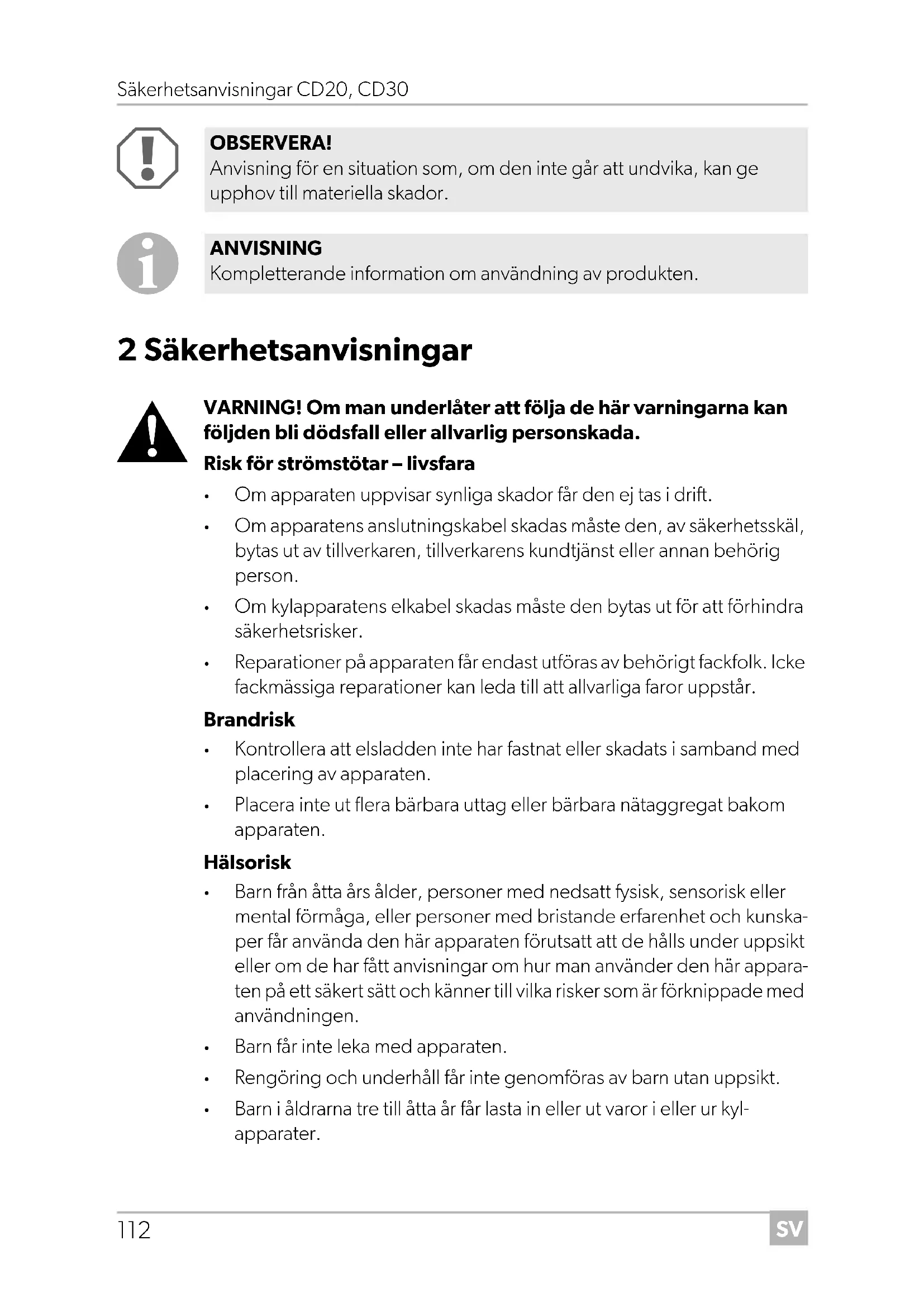 Barn i åldrarna tre till åtta år får lasta in eller ut varor i eller ur kyl- apparater. OBSERVERA! Anvisning för en situation som, om den inte går att undvika, kan ge upphov till materiella skador. ANVISNING Kompletterande information om användning av produkten. CD20-30-IO-16s.book Seite 112 Montag, 18. Mai 2020 2:25 14SV CD20, CD30 Säkerhetsanvisningar