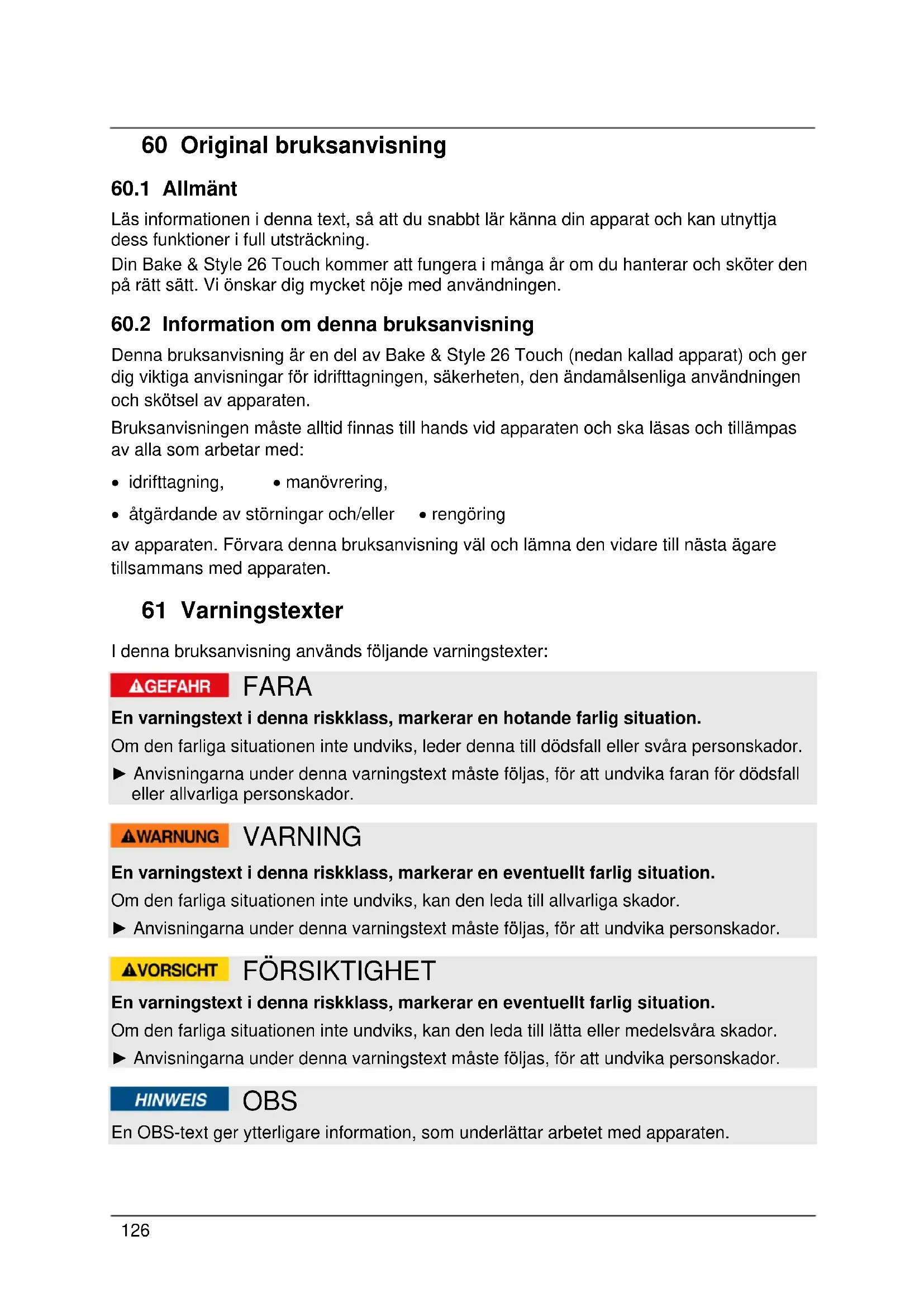 - åtgärdande av störningar och/eller • rengöring av apparaten. Förvara denna bruksanvisning väl och lämna den vidare till nästa ägare tillsammans med apparaten. 61 Varningstexter I denna bruksanvisning används följande varningstexter: FARA En varningstext i denna riskklass, markerar en hotande farlig situation. Om den farliga situationen inte undviks, leder denna till dödsfall eller svåra personskador. ► Anvisningarna under denna varningstext måste följas, för att undvika faran för dödsfall eller allvarliga personskador. VARNING En varningstext i denna riskklass, markerar en eventuellt farlig situation. Om den farliga situationen inte undviks, kan den leda till allvarliga skador. ► Anvisningarna under denna varningstext måste följas, för att undvika personskador. FÖRSIKTIGHET En varningstext i denna riskklass, markerar en eventuellt farlig situation. Om den farliga situationen inte undviks, kan den leda till lätta eller medelsvåra skador. ► Anvisningarna under denna varningstext måste följas, för att undvika personskador. OBS En OBS-text ger ytterligare information, som underlättar arbetet med apparaten.127 62 Ansvarsbegränsning All teknisk information i denna bruksanvisning, liksom data och anvisningar för installation, drift och skötsel svarar mot aktuell nivå vid pressläggningen och lämnas mot bakgrund av våra hittillsvarande erfarenheter och kunskaper. Inga anspråk kan ställas med anledning av uppgifterna, bilderna och beskrivningarna i denna anvisning. Tillverkaren påtar sig inget ansvar för skador till följd av: