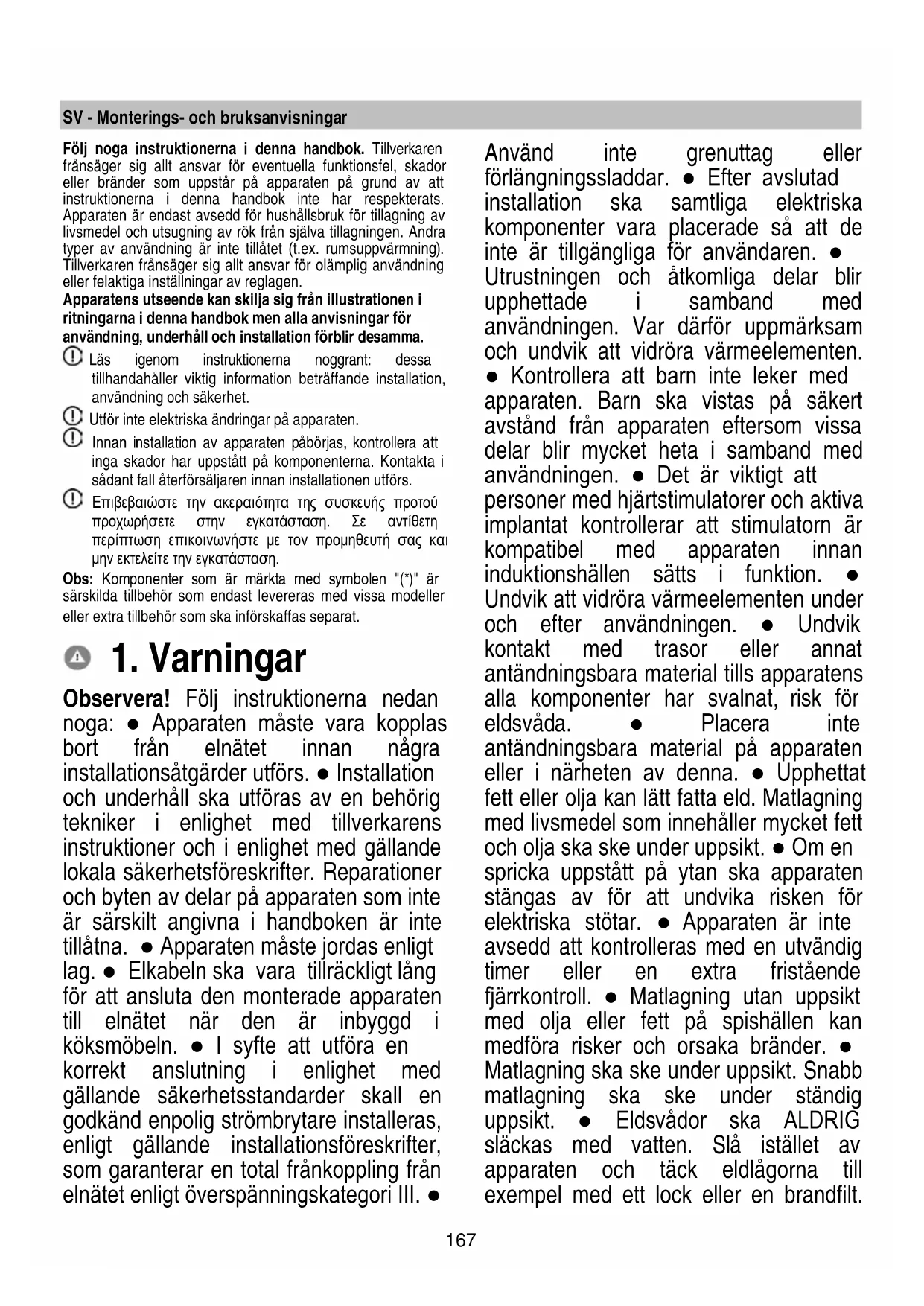 Στην περίπτωση που η βλάβη παραμένει -μετά τη διενέργεια των παραπάνω ελέγχων- επικοινωνήστε με το πλησιέστερο Τμήμα Τεχνικής Υποστήριξης.167 SV - Monterings- och bruksanvisningar Följ noga instruktionerna i denna handbok. Tillverkaren frånsäger sig allt ansvar för eventuella funktionsfel, skador eller bränder som uppstår på apparaten på grund av att instruktionerna i denna handbok inte har respekterats. Apparaten är endast avsedd för hushållsbruk för tillagning av livsmedel och utsugning av rök från själva tillagningen. Andra typer av användning är inte tillåtet (t.ex. rumsuppvärmning). Tillverkaren frånsäger sig allt ansvar för olämplig användning eller felaktiga inställningar av reglagen. Apparatens utseende kan skilja sig från illustrationen i ritningarna i denna handbok men alla anvisningar för användning, underhåll och installation förblir desamma. Läs igenom instruktionerna noggrant: dessa tillhandahåller viktig information beträffande installation, användning och säkerhet. Utför inte elektriska ändringar på apparaten. Innan installation av apparaten påbörjas, kontrollera att inga skador har uppstått på komponenterna. Kontakta i sådant fall återförsäljaren innan installationen utförs. Επιβεβαιώστε την ακεραιότητα της συσκευής προτού προχωρήσετε στην εγκατάσταση. Σε αντίθετη περίπτωση επικοινωνήστε με τον προμηθευτή σας και μην εκτελείτε την εγκατάσταση. Obs: Komponenter som är märkta med symbolen "(*)" är särskilda tillbehör som endast levereras med vissa modeller eller extra tillbehör som ska införskaffas separat.