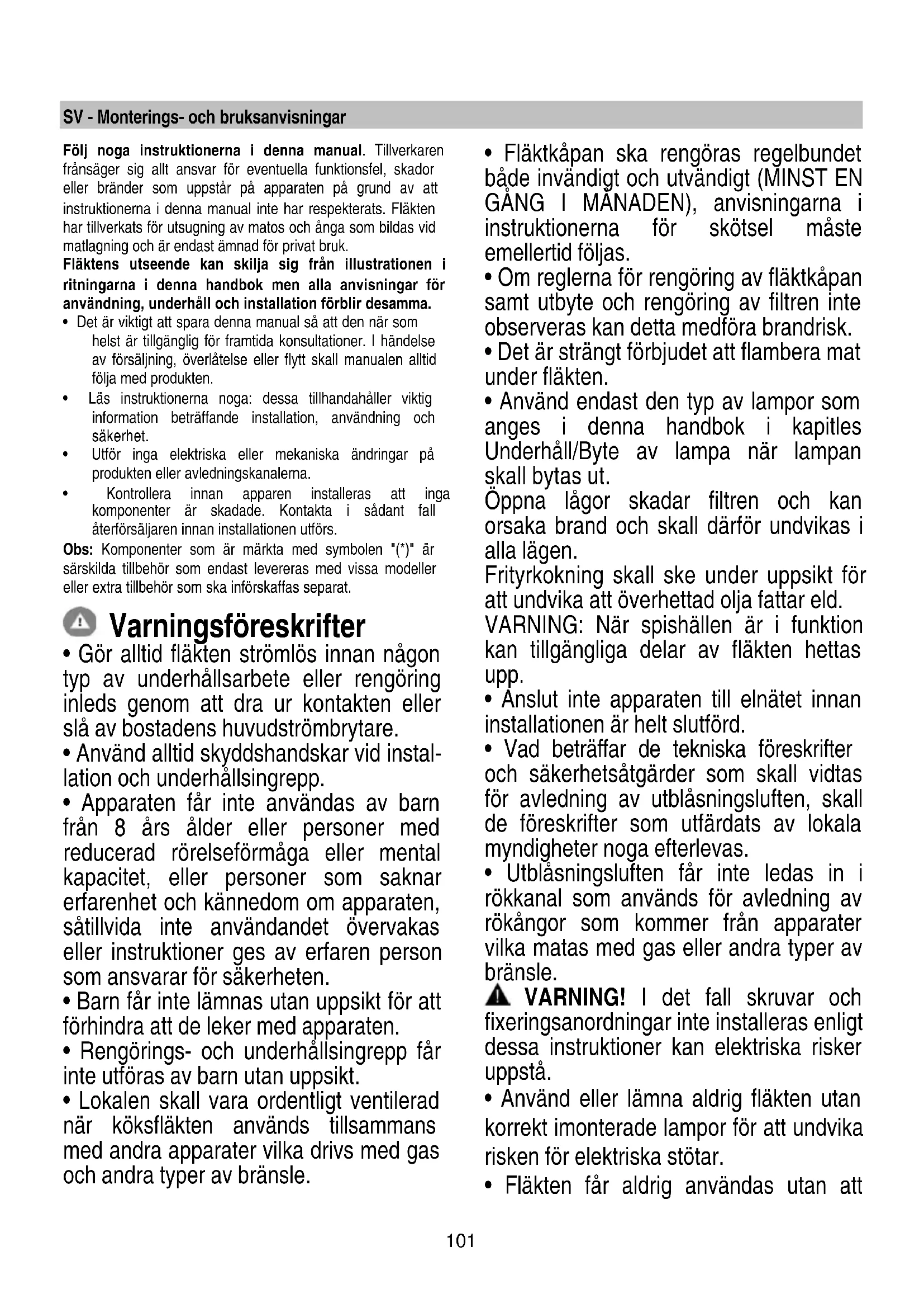 Το σύστημα φωτισμού δεν μπορεί να αντικατασταθεί από τον χρήστη, σε περίπτωση δυσλειτουργίας επικοινωνήστε με την υπηρεσία υποστήριξης.101 SV - Monterings- och bruksanvisningar Följ noga instruktionerna i denna manual. Tillverkaren frånsäger sig allt ansvar för eventuella funktionsfel, skador eller bränder som uppstår på apparaten på grund av att instruktionerna i denna manual inte har respekterats. Fläkten har tillverkats för utsugning av matos och ånga som bildas vid matlagning och är endast ämnad för privat bruk. Fläktens utseende kan skilja sig från illustrationen i ritningarna i denna handbok men alla anvisningar för användning, underhåll och installation förblir desamma.