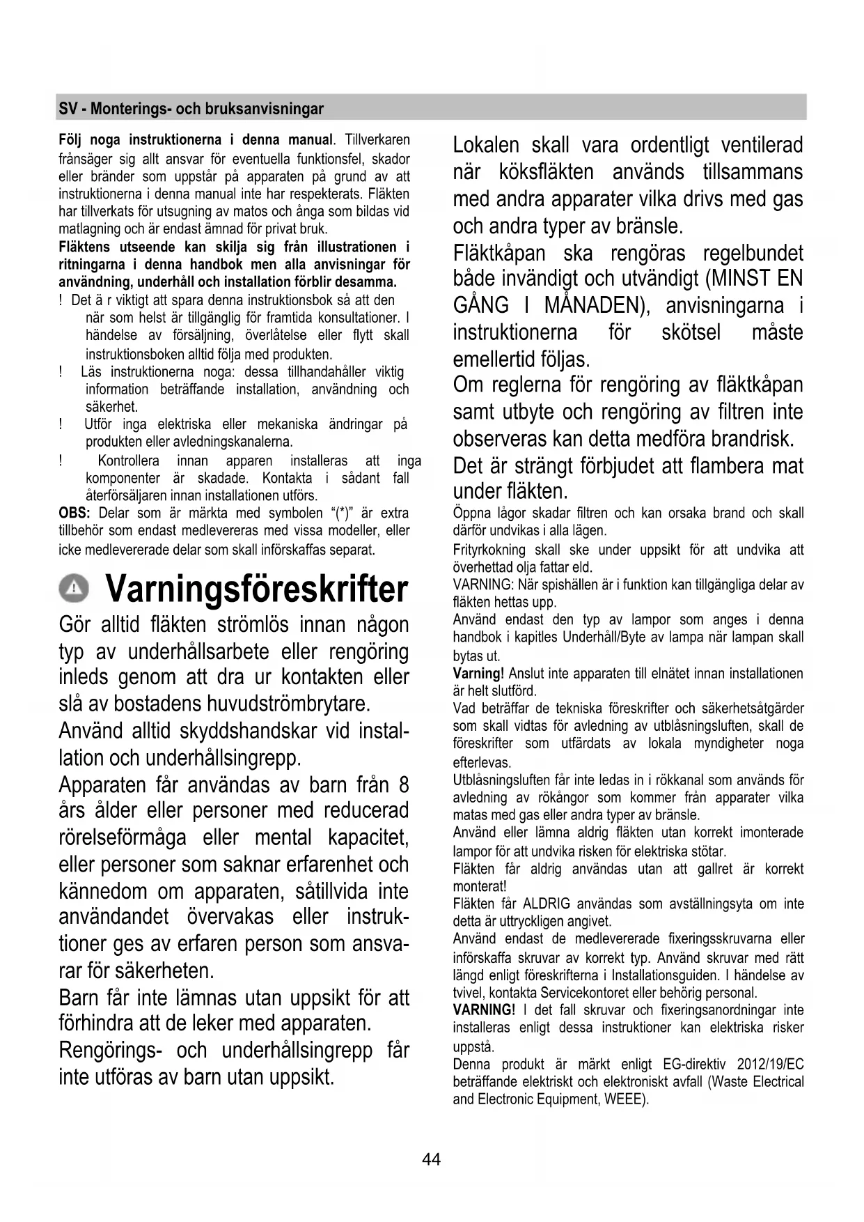 Για την αντικατάσταση τους, απευθυνθείτε στην υπηρεσία τεχνικής βοήθειας44 SV - Monterings- och bruksanvisningar Följ noga instruktionerna i denna manual. Tillverkaren frånsäger sig allt ansvar för eventuella funktionsfel, skador eller bränder som uppstår på apparaten på grund av att instruktionerna i denna manual inte har respekterats. Fläkten har tillverkats för utsugning av matos och ånga som bildas vid matlagning och är endast ämnad för privat bruk. Fläktens utseende kan skilja sig från illustrationen i ritningarna i denna handbok men alla anvisningar för användning, underhåll och installation förblir desamma. ! Det ä r viktigt att spara denna instruktionsbok så att den när som helst är tillgänglig för framtida konsultationer. I händelse av försäljning, överlåtelse eller flytt skall instruktionsboken alltid följa med produkten. ! Läs instruktionerna noga: dessa tillhandahåller viktig information beträffande installation, användning och säkerhet. ! Utför inga elektriska eller mekaniska ändringar på produkten eller avledningskanalerna. ! Kontrollera innan apparen installeras att inga komponenter är skadade. Kontakta i sådant fall återförsäljaren innan installationen utförs. OBS: Delar som är märkta med symbolen “(*)” är extra tillbehör som endast medlevereras med vissa modeller, eller icke medlevererade delar som skall införskaffas separat. Varningsföreskrifter Gör alltid fläkten strömlös innan någon typ av underhållsarbete eller rengöring inleds genom att dra ur kontakten eller slå av bostadens huvudströmbrytare. Använd alltid skyddshandskar vid instal- lation och underhållsingrepp. Apparaten får användas av barn från 8 års ålder eller personer med reducerad rörelseförmåga eller mental kapacitet, eller personer som saknar erfarenhet och kännedom om apparaten, såtillvida inte användandet övervakas eller instruk- tioner ges av erfaren person som ansva- rar för säkerheten. Barn får inte lämnas utan uppsikt för att förhindra att de leker med apparaten. Rengörings- och underhållsingrepp får inte utföras av barn utan uppsikt. Lokalen skall vara ordentligt ventilerad när köksfläkten används tillsammans med andra apparater vilka drivs med gas och andra typer av bränsle. Fläktkåpan ska rengöras regelbundet både invändigt och utvändigt (MINST EN GÅNG I MÅNADEN), anvisningarna i instruktionerna för skötsel måste emellertid följas. Om reglerna för rengöring av fläktkåpan samt utbyte och rengöring av filtren inte observeras kan detta medföra brandrisk. Det är strängt förbjudet att flambera mat under fläkten. Öppna lågor skadar filtren och kan orsaka brand och skall därför undvikas i alla lägen. Frityrkokning skall ske under uppsikt för att undvika att överhettad olja fattar eld. VARNING: När spishällen är i funktion kan tillgängliga delar av fläkten hettas upp. Använd endast den typ av lampor som anges i denna handbok i kapitles Underhåll/Byte av lampa när lampan skall bytas ut. Varning! Anslut inte apparaten till elnätet innan installationen är helt slutförd. Vad beträffar de tekniska föreskrifter och säkerhetsåtgärder som skall vidtas för avledning av utblåsningsluften, skall de föreskrifter som utfärdats av lokala myndigheter noga efterlevas. Utblåsningsluften får inte ledas in i rökkanal som används för avledning av rökångor som kommer från apparater vilka matas med gas eller andra typer av bränsle. Använd eller lämna aldrig fläkten utan korrekt imonterade lampor för att undvika risken för elektriska stötar. Fläkten får aldrig användas utan att gallret är korrekt monterat! Fläkten får ALDRIG användas som avställningsyta om inte detta är uttryckligen angivet. Använd endast de medlevererade fixeringsskruvarna eller införskaffa skruvar av korrekt typ. Använd skruvar med rätt längd enligt föreskrifterna i Installationsguiden. I händelse av tvivel, kontakta Servicekontoret eller behörig personal. VARNING! I det fall skruvar och fixeringsanordningar inte installeras enligt dessa instruktioner kan elektriska risker uppstå. Denna produkt är märkt enligt EG-direktiv 2012/19/EC beträffande elektriskt och elektroniskt avfall (Waste Electrical and Electronic Equipment, WEEE).45 Genom att säkerställa en korrekt kassering av denna produkt bidrar du till att förhindra potentiella, negativa konsekvenser för vår miljö och vår hälsa, som annars kan bli följden om produkten inte hanteras på rätt sätt. Symbolen på produkten, eller i medföljande dokumentation, indikerar att denna produkt inte får behandlas som vanligt hushållsavfall. Den skall i stället lämnas in på en lämplig uppsamlingsplats för återvinning av elektrisk och elektronisk utrustning. Produkten måste kasseras enligt lokala miljöbestämmelser för avfallshantering. För mer information om hantering, återvinning och återanvändning av denna produkt, var god kontakta de lokala myndigheterna, ortens sophanteringstjänst eller butiken där produkten inhandlades. Apparat utformad, testad och tillverkad i enlighet med: