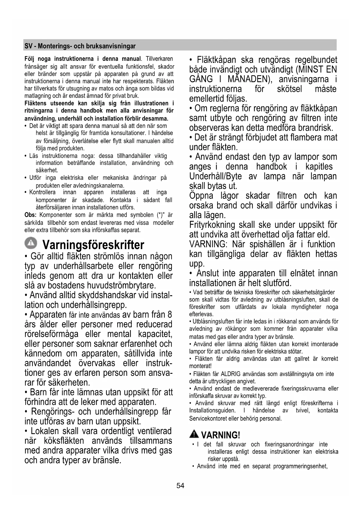 Για την αντικατάσταση των λαμπτήρων, επικοινωνήστε με το εξουσιοδοτημένο κέντρο ανταλλακτικών.54 SV - Monterings- och bruksanvisningar Följ noga instruktionerna i denna manual. Tillverkaren frånsäger sig allt ansvar för eventuella funktionsfel, skador eller bränder som uppstår på apparaten på grund av att instruktionerna i denna manual inte har respekterats. Fläkten har tillverkats för utsugning av matos och ånga som bildas vid matlagning och är endast ämnad för privat bruk. Fläktens utseende kan skilja sig från illustrationen i ritningarna i denna handbok men alla anvisningar för användning, underhåll och installation förblir desamma.