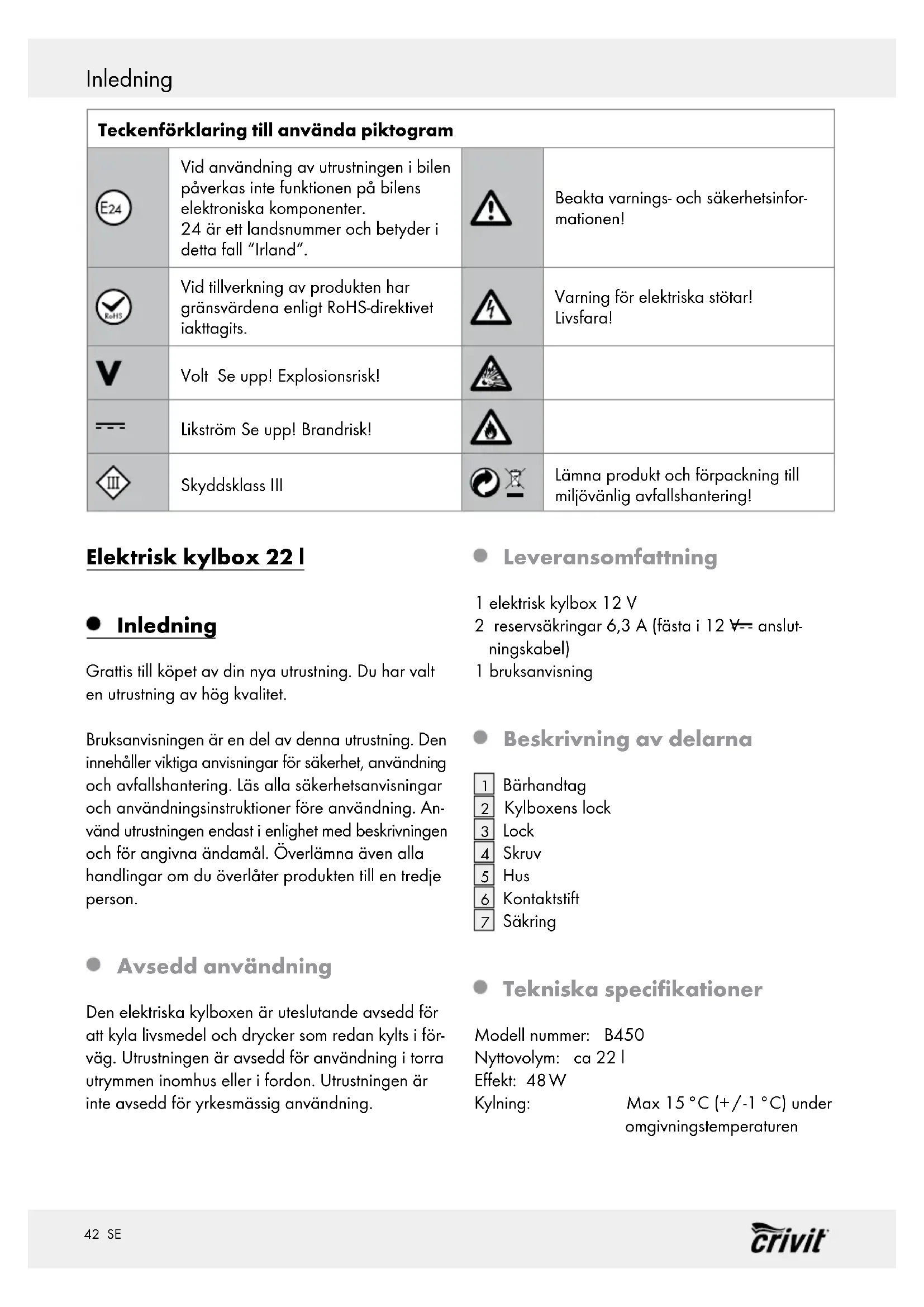 Säkring Tekniska specifikationer Modell nummer: B450 Nyttovolym: ca 22 l Effekt: 48 W Kylning: Max 15 °C (+ / -1 °C) under omgivningstemperaturen43 SE Inledning / Allmän säkerhetsinformation Isolering: Styropor (expanderad polys- tyren EPS) Kylenhet: termoelektriskt peltier element Klimatklass: N Anslutningsspänning: 12 V Skyddsklass: III / Vikt: 2,5 kg Allmän säkerhetsinformation