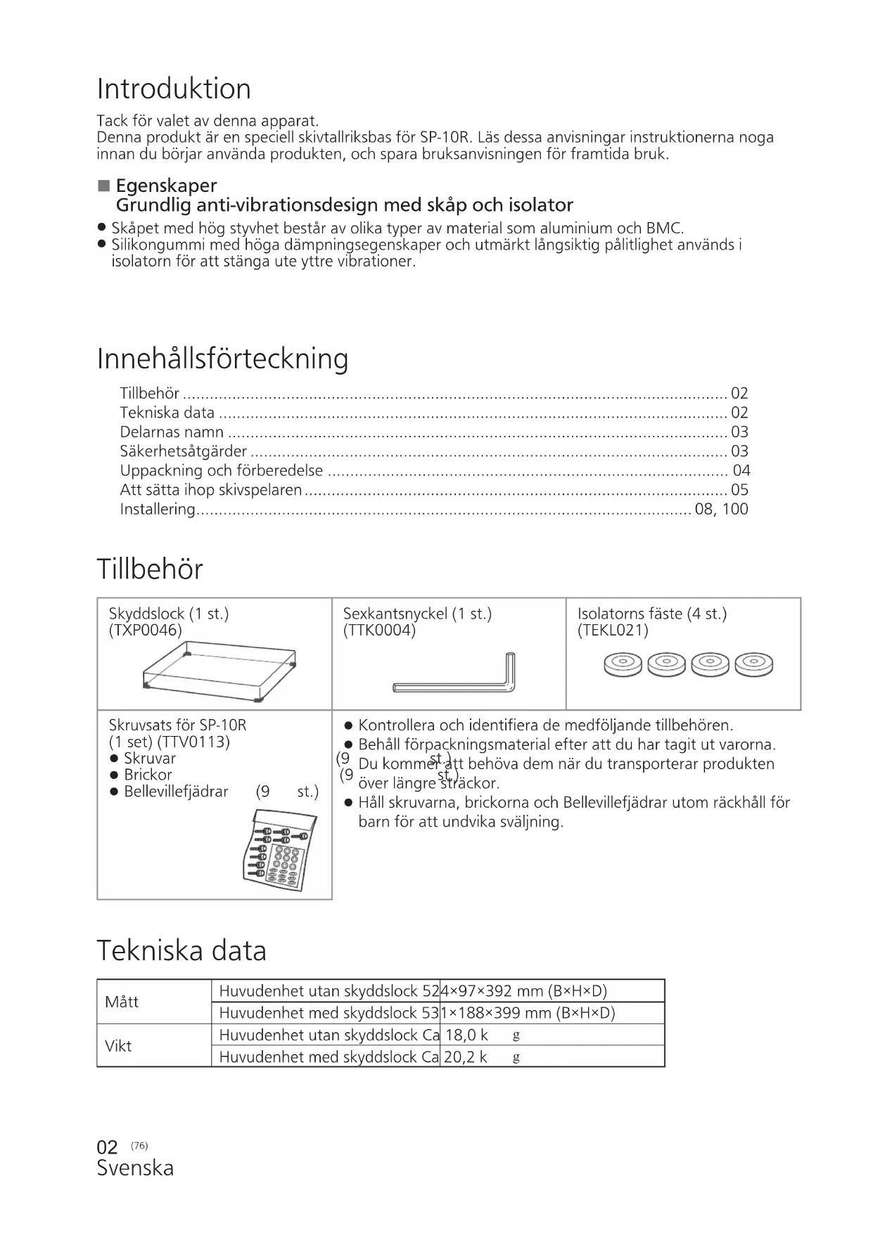 Silikongummi med höga dämpningsegenskaper och utmärkt långsiktig pålitlighet används i isolatorn för att stänga ute yttre vibrationer. Introduktion Tack för valet av denna apparat. Denna produkt är en speciell skivtallriksbas för SP-10R. Läs dessa anvisningar instruktionerna noga innan du börjar använda produkten, och spara bruksanvisningen för framtida bruk. Tillbehör Skyddslock (1 st.) (TXP0046) Sexkantsnyckel (1 st.) (TTK0004) Isolatorns fäste (4 st.) (TEKL021) Skruvsats för SP-10R (1 set)