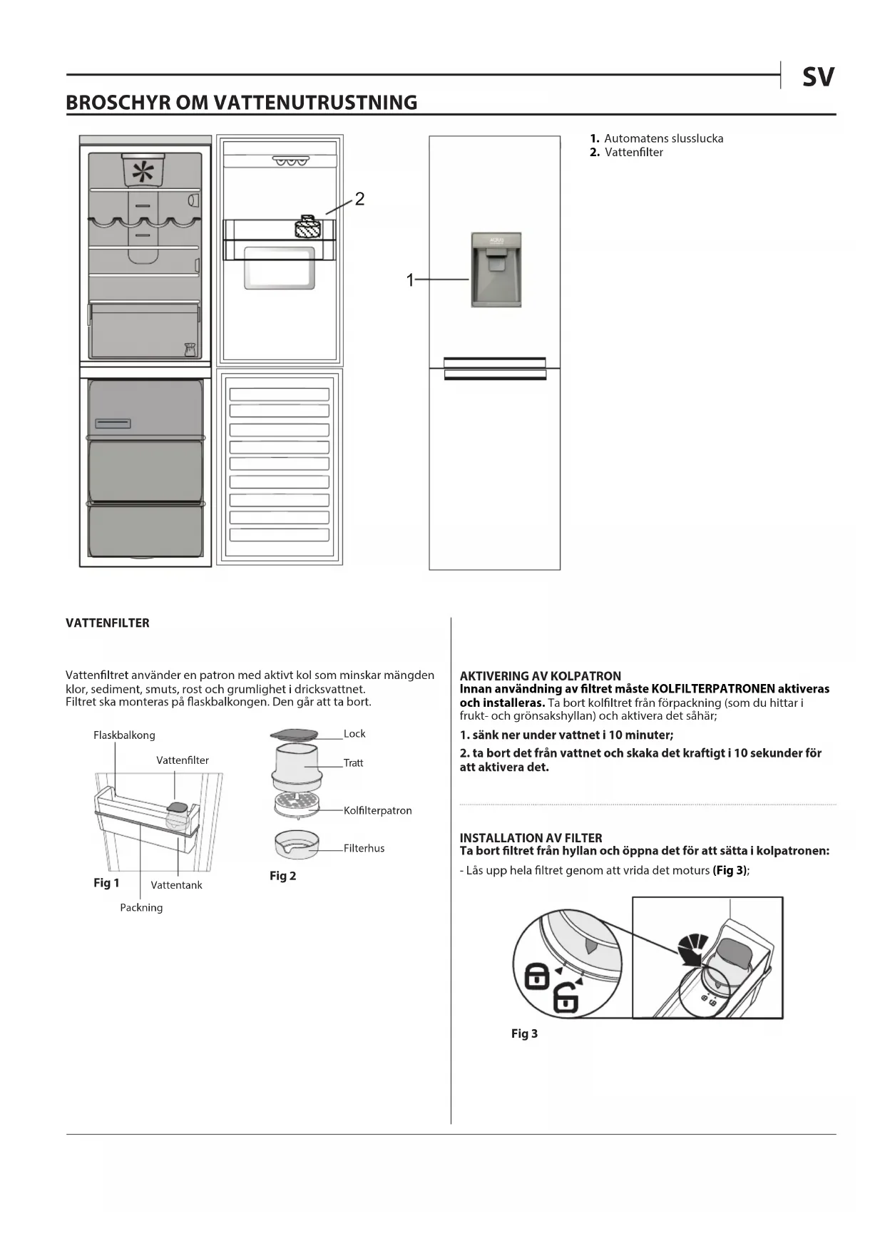 VATTENFILTER Vattenltret använder en patron med aktivt kol som minskar mängden klor, sediment, smuts, rost och grumlighet i dricksvattnet. Filtret ska monteras på askbalkongen. Den går att ta bort. Fig 1 Fig 2 Flaskbalkong Vattenlter Vattentank Lock Tratt Kollterpatron Filterhus Packning