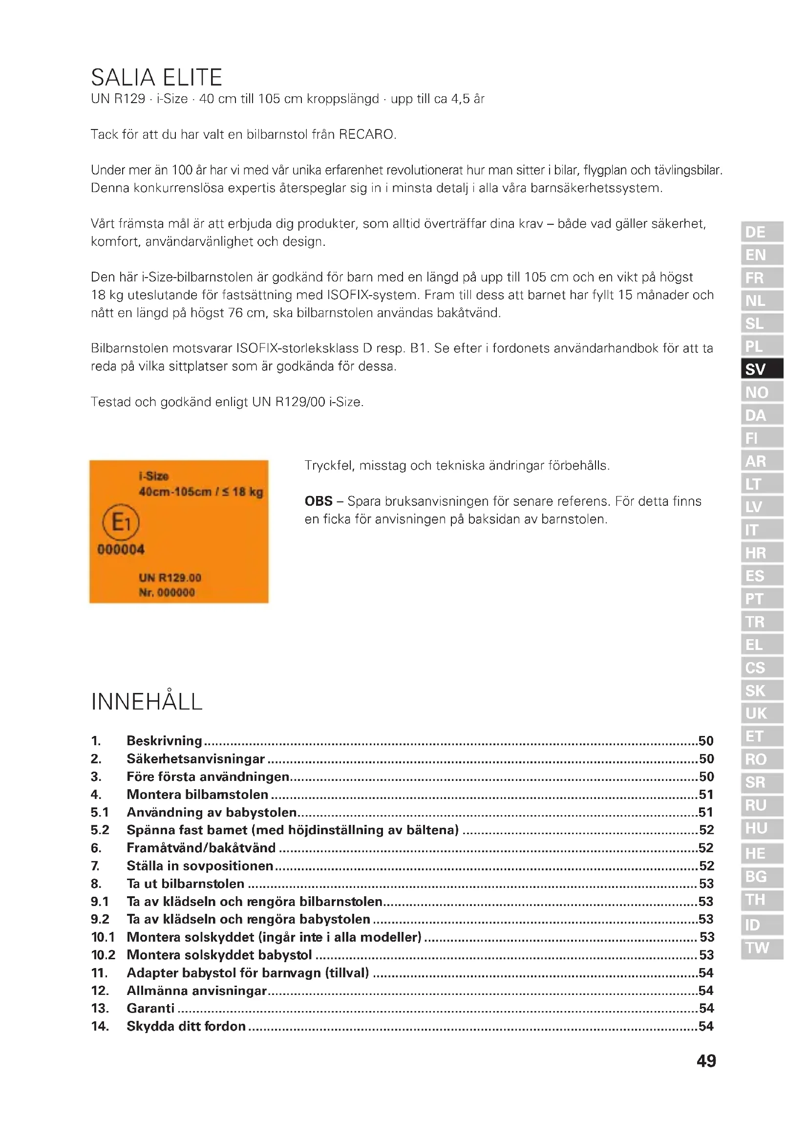 - SALIA ELITE UN R129 · i-Size · 40 cm till 105 cm kroppslängd · upp till ca 4,5 år Tack för att du har valt en bilbarnstol från RECARO. Under mer än 100 år har vi med vår unika erfarenhet revolutionerat hur man sitter i bilar, flygplan och tävlingsbilar. Denna konkurrenslösa expertis återspeglar sig in i minsta detalj i alla våra barnsäkerhetssystem. Vårt främsta mål är att erbjuda dig produkter, som alltid överträffar dina krav – både vad gäller säkerhet, komfort, användarvänlighet och design. Den här i-Size-bilbarnstolen är godkänd för barn med en längd på upp till 105 cm och en vikt på högst 18kg uteslutande för fastsättning med ISOFIX-system. Fram till dess att barnet har fyllt 15 månader och nått en längd på högst 76 cm, ska bilbarnstolen användas bakåtvänd. Bilbarnstolen motsvarar ISOFIX-storleksklass D resp. B1. Se efter i fordonets användarhandbok för att ta reda på vilka sittplatser som är godkända för dessa. Testad och godkänd enligt UN R129/00 i-Size. Tryckfel, misstag och tekniska ändringar förbehålls. OBS – Spara bruksanvisningen för senare referens. För detta finns en ficka för anvisningen på baksidan av barnstolen. INNEHÅLL 1. Beskrivning p. 50