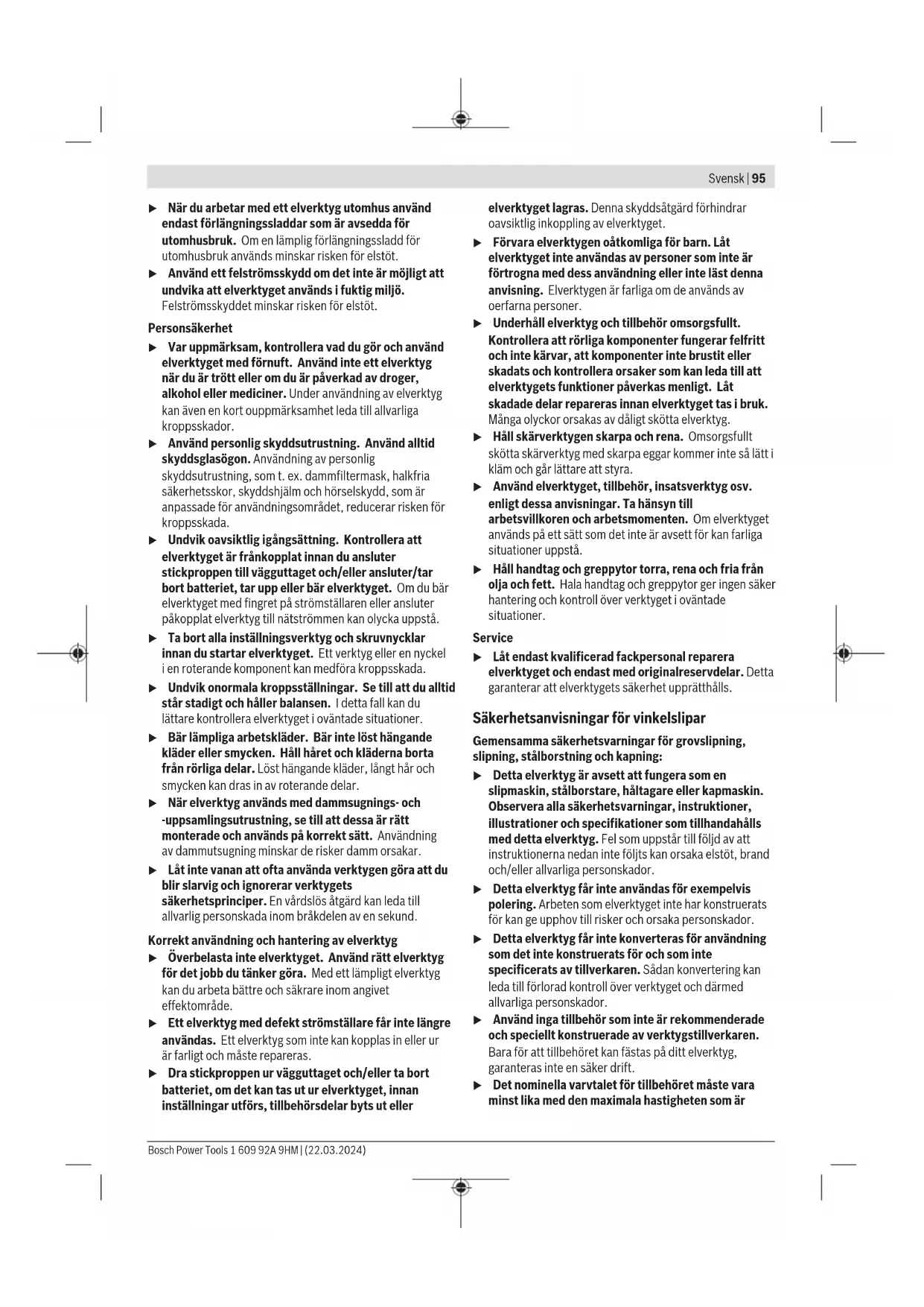 Kontaktudførelse med lås For at tænde el-værktøjet skal du først trykke på tænd/sluk- knappen(2) ➊ og derefter skubbe den fremad ➋. Tryk der- efter på den, og hold den inde ➌. For at låse den nedtrykkede tænd/sluk-knap(2) skal du skubbe tænd/sluk-knappen(2) videre frem ➍. For at slukke el-værktøjet skal du slippe tænd/sluk- knappen(2) eller, hvis den er låst, trykke kort på tænd/sluk- knappen(2) og slippe den igen. Knapmodel uden låsefunktion Bosch Power Tools 1 609 92A 9HM | (22.03.2024)94 | Svensk For at tænde el-værktøjet skal du først trykke på tænd/sluk- knappen(2) ➊ og derefter skubbe den fremad ➋. Tryk der- efter på den, og hold den inde ➌. El‑værktøjet slukkes ved at slippe tænd/sluk-kontakten(2) igen. u Kontrollér slibeværktøjet før brug. Slibeværktøjet skal være monteret sikkert, så det kan dreje frit. Fore- tag en prøvekørsel i mindst 1 minut uden belastning. Brug ikke beskadigede, ikke-runde eller vibrerende slibeværktøjer. Beskadigede slibeværktøjer kan gå i stykker og forårsage skader. Vedligeholdelse og service Vedligeholdelse og rengøring u Træk stikket ud af stikkontakten, før der udføres ar- bejde på el‑værktøjet. u El‑værktøj og el‑værktøjets ventilationsåbninger skal altid holdes rene for at sikre et godt og sikkert ar- bejde. u Brug så vidt muligt altid et udsugningsanlæg ved ek- streme anvendelsesforhold. Blæs ventilationsåbnin- gerne igennem med hyppige mellemrum, og forkobl en fejlstrømsafbryder (PRCD). Ved bearbejdning af me- tal kan ledende støv aflejre sig inde i elværktøjet. Elværk- tøjets beskyttelsesisolering kan forringes. Opbevar og behandle tilbehøret omhyggeligt. Hvis det er nødvendigt at erstatte tilslutningsledningen, skal dette arbejde udføres af Bosch eller på et autoriseret servi- ceværksted for Bosch el‑værktøj for at undgå farer. Kundeservice og anvendelsesrådgivning Kundeservice besvarer dine spørgsmål vedr. reparation og vedligeholdelse af dit produkt samt reservedele. Eksplo- sionstegninger og oplysninger om reservedele finder du også på: www.bosch-pt.com Bosch-anvendelsesrådgivningsteamet hjælper dig gerne, hvis du har spørgsmål til produkter og tilbehørsdele. Produktets 10‑cifrede typenummer (se typeskilt) skal altid angives ved forespørgsler og bestilling af reservedele. Dansk Bosch Service Center Telegrafvej 3 2750 Ballerup På www.bosch-pt.dk kan der online bestilles reservedele el- ler oprettes en reparations ordre. Tlf. Service Center: 44898855 Fax: 44898755 E-Mail: vaerktoej@dk.bosch.com Du finder adresser til andre værksteder på: www.bosch-pt.com/serviceaddresses Bortskaffelse El‑værktøj, tilbehør og emballage skal genbruges på en miljø- venlig måde. Smid ikke el-værktøj ud sammen med det al- mindelige husholdningsaffald! Gælder kun i EU‑lande: Iht. det europæiske direktiv 2012/19/EU om affald af elek- trisk og elektronisk udstyr skal kasseret elektrisk udstyr ind- samles separat og genbruges iht. gældende miljøforskrifter. Ved forkert bortskaffelse kan elektrisk og elektronisk affald have skadelige virkninger på miljøet og menneskers sundhed på grund af den mulige tilstedeværelse af farlige stoffer. Svensk Säkerhetsanvisningar Allmänna säkerhetsanvisningar för elverktyg VARNING Läs alla säkerhetsvarningar, instruktioner och specifikationer som tillhandahålls med detta elverktyg. Fel som uppstår till följd av att instruktionerna nedan inte följts kan orsaka elstöt, brand och/eller allvarliga personskador. Förvara alla varningar och anvisningar för framtida bruk. Begreppet Elverktyg hänför sig till nätdrivna elverktyg (med nätsladd) och till batteridrivna elverktyg (sladdlösa). Arbetsplatssäkerhet u Håll ditt arbetsområde rent och väl upplyst. Ostädade och mörka areor ökar olycksrisken. u Använd inte elverktyget i explosionsfarliga omgivningar när det t.ex. finns brännbara vätskor, gaser eller damm. Elverktygen alstrar gnistor som kan antända dammet eller gaserna. u Håll under arbetet med elverktyget barn och obehöriga personer på betryggande avstånd. Om du störs av obehöriga personer kan du förlora kontrollen över elverktyget. Elektrisk säkerhet u Elverktygets stickpropp måste passa till vägguttaget. Stickproppen får absolut inte förändras. Använd inte adapterkontakter tillsammans med skyddsjordade elverktyg. Oförändrade stickproppar och passande vägguttag reducerar risken för elstöt. u Undvik kroppskontakt med jordade ytor som t.ex. rör, värmeelement, spisar och kylskåp. Det finns en större risk för elstöt om din kropp är jordad. u Skydda elverktyg mot regn och väta. Tränger vatten in i ett elverktyg ökar risken för elstöt. u Missbruka inte nätsladden. Använd inte nätsladden för att bära eller hänga upp elverktyget och inte heller för att dra stickproppen ur vägguttaget. Skadade eller tilltrasslade ledningar ökar risken för elstöt. 1 609 92A 9HM | (22.03.2024) Bosch Power ToolsSvensk | 95 u När du arbetar med ett elverktyg utomhus använd endast förlängningssladdar som är avsedda för utomhusbruk. Om en lämplig förlängningssladd för utomhusbruk används minskar risken för elstöt. u Använd ett felströmsskydd om det inte är möjligt att undvika att elverktyget används i fuktig miljö. Felströmsskyddet minskar risken för elstöt. Personsäkerhet u Var uppmärksam, kontrollera vad du gör och använd elverktyget med förnuft. Använd inte ett elverktyg när du är trött eller om du är påverkad av droger, alkohol eller mediciner. Under användning av elverktyg kan även en kort ouppmärksamhet leda till allvarliga kroppsskador. u Använd personlig skyddsutrustning. Använd alltid skyddsglasögon. Användning av personlig skyddsutrustning, som t. ex. dammfiltermask, halkfria säkerhetsskor, skyddshjälm och hörselskydd, som är anpassade för användningsområdet, reducerar risken för kroppsskada. u Undvik oavsiktlig