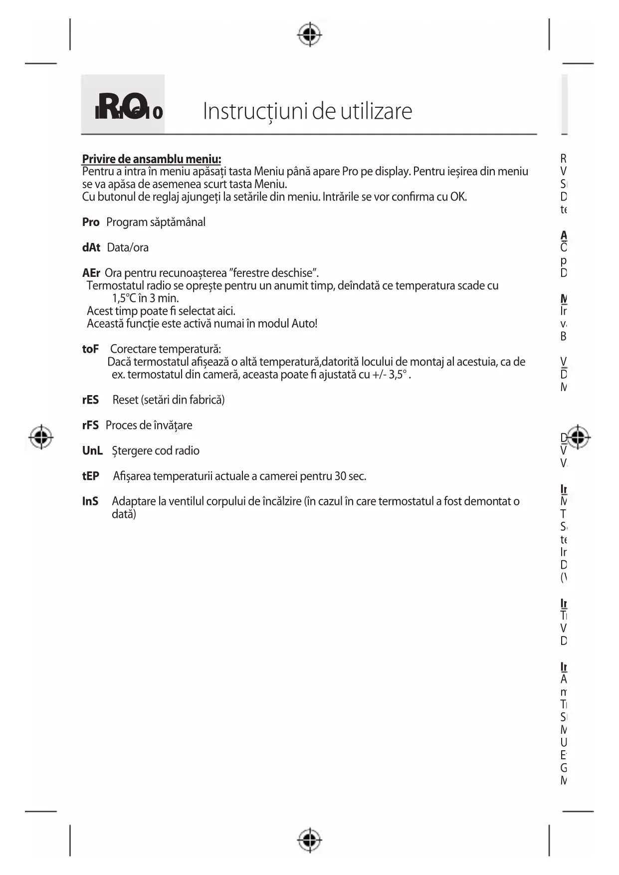 Pro Veckoprogram dAt Datum/Tid AEr Tid för “Fönster öppet“ identifiering. Radio-termostaten kopplas in under en bestämd tid, så snart temperaturen faller med 1,5°C inom 3 min. Den här tiden kan väljas här. Den här funktionen är bara aktiv i auto-läge! toF Temperaturkorrigering: Om termostaten, på grund av sin monteringsplats, visar en annan temperatur än t.ex. rumstermostaten, så kan denna anpassas med +/- 3,5°. rES Återställ (fabriksinställning) rFS Inlärningsförfarande UnL Radera radiokod tEP Visar den aktuella rumstempareturen under 30 sek. InS Anpassa elementventil (om termostaten har monteras bort någon gång) ITH-610