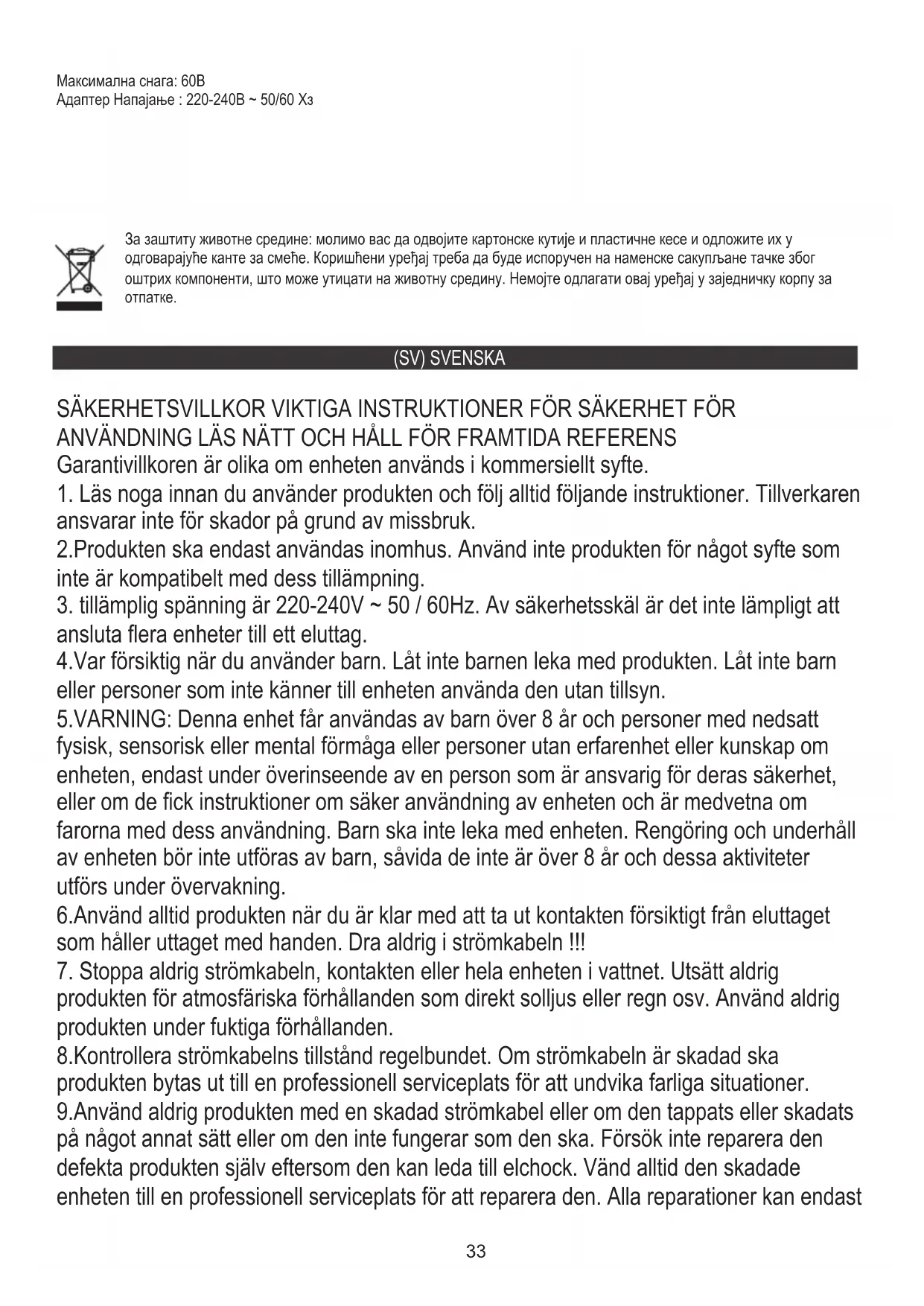 ansluta flera enheter till ett eluttag. 4.Var försiktig när du använder barn. Låt inte barnen leka med produkten. Låt inte barn eller personer som inte känner till enheten använda den utan tillsyn. 5.VARNING: Denna enhet får användas av barn över 8 år och personer med nedsatt fysisk, sensorisk eller mental förmåga eller personer utan erfarenhet eller kunskap om enheten, endast under överinseende av en person som är ansvarig för deras säkerhet, eller om de fick instruktioner om säker användning av enheten och är medvetna om farorna med dess användning. Barn ska inte leka med enheten. Rengöring och underhåll av enheten bör inte utföras av barn, såvida de inte är över 8 år och dessa aktiviteter utförs under övervakning. 6.Använd alltid produkten när du är klar med att ta ut kontakten försiktigt från eluttaget som håller uttaget med handen. Dra aldrig i strömkabeln !!!