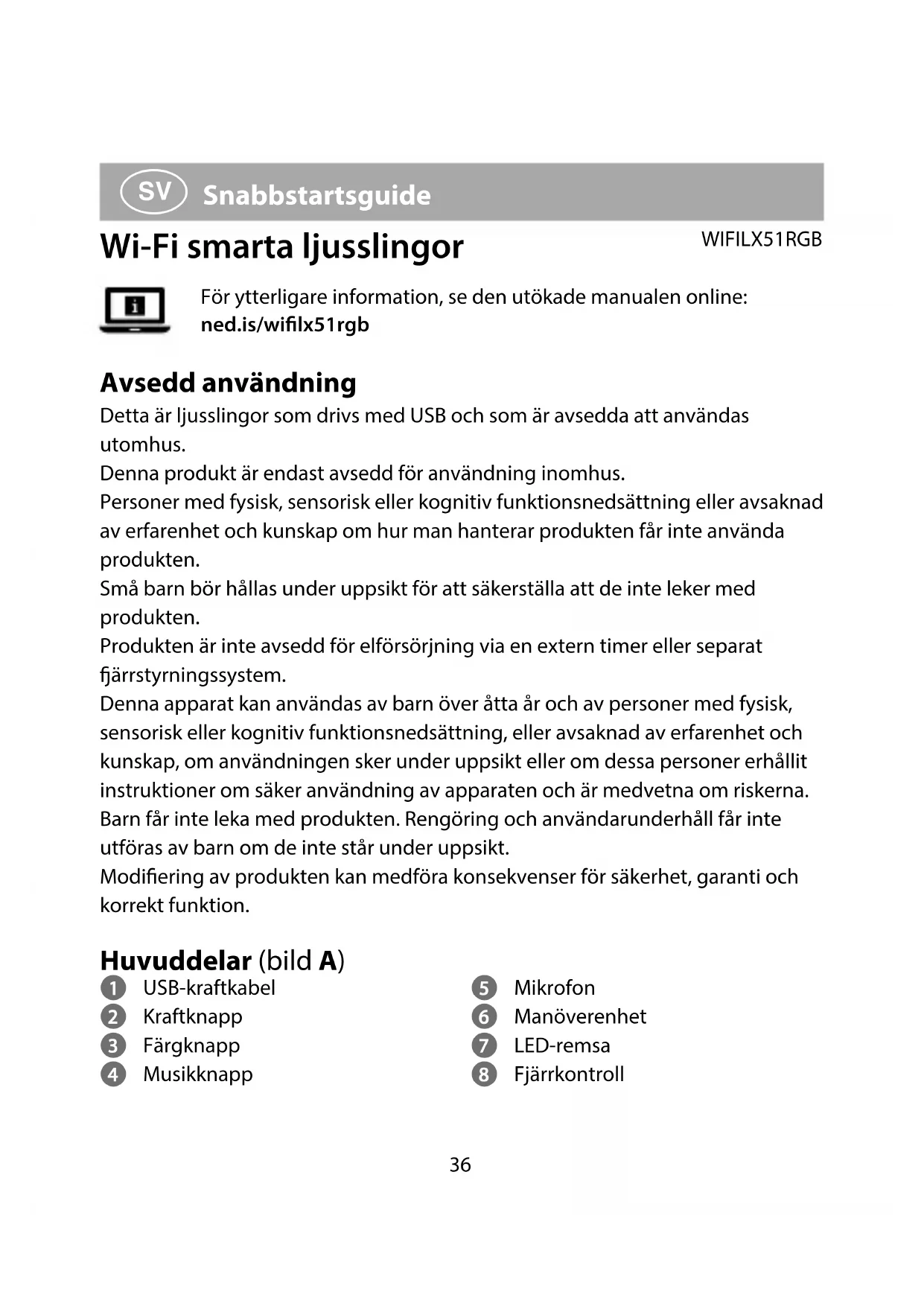 Snabbstartsguide Wi-Fi smarta ljusslingor WIFILX51RGB För ytterligare information, se den utökade manualen online: ned.is/wilx51rgb Avsedd användning Detta är ljusslingor som drivs med USB och som är avsedda att användas utomhus. Denna produkt är endast avsedd för användning inomhus. Personer med fysisk, sensorisk eller kognitiv funktionsnedsättning eller avsaknad av erfarenhet och kunskap om hur man hanterar produkten får inte använda produkten. Små barn bör hållas under uppsikt för att säkerställa att de inte leker med produkten. Produkten är inte avsedd för elförsörjning via en extern timer eller separat ärrstyrningssystem. Denna apparat kan användas av barn över åtta år och av personer med fysisk, sensorisk eller kognitiv funktionsnedsättning, eller avsaknad av erfarenhet och kunskap, om användningen sker under uppsikt eller om dessa personer erhållit instruktioner om säker användning av apparaten och är medvetna om riskerna. Barn får inte leka med produkten. Rengöring och användarunderhåll får inte utföras av barn om de inte står under uppsikt. Modiering av produkten kan medföra konsekvenser för säkerhet, garanti och korrekt funktion. Huvuddelar (bild A) 1 USB-kraftkabel 2 Kraftknapp 3 Färgknapp 4 Musikknapp 5 Mikrofon 6 Manöverenhet 7 LED-remsa 8 Fjärrkontroll37 Säkerhetsanvisningar Använd inte produkten där vatten kan stänka på den såsom i badrum, nära simbassänger eller handfat.