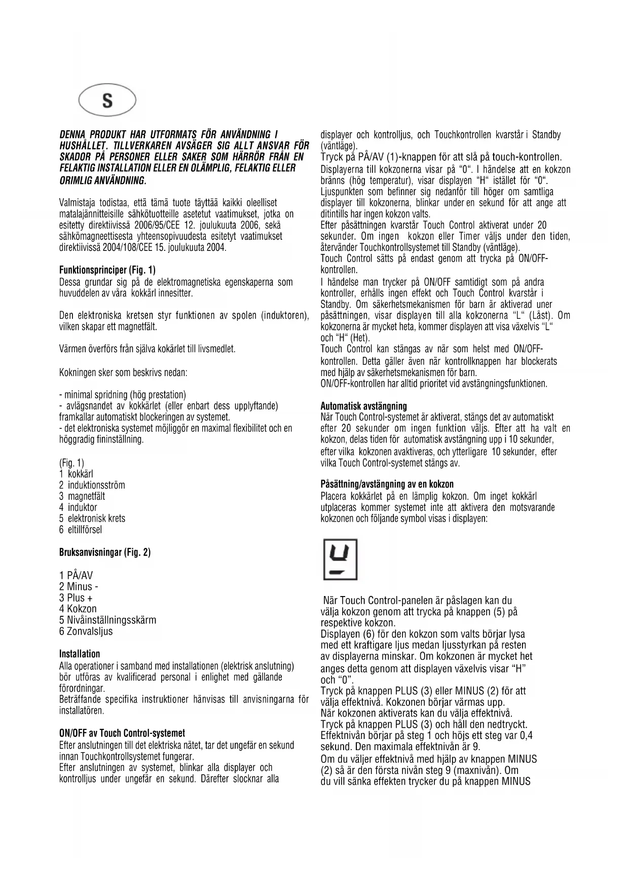 Säkerhetsmekanism för barn:Blockering av touchkontrollerna: För att aktivera säkerhetsmekanismen för barn efter påsättning av touchkontrollen, bör man trycka samtidigt på valfunktionen på den högra nederdelen och MINUS-knappen, och därefter trycka på nytt på valfunktionen på den högra nederdelen. Displayen kommer att visa symbolen “L” för LÅST (säkerhetsmekanismen för barn mot ofrivillig påsättning). Om kokzonen är mycket het, visas “L” och “H” växelvis. Denna operation bör äga rum inom de påföljande 10 sekunderna. Ingen annan funktion bör tryckas på förutom de som angivits; i motsatt fall avbryts sekvensen och induktionshällen blockeras inte. Det elektroniska kontrollsystemet fortsätter i blockerat tillstånd tills det avblockeras av användaren, till och med om systemet stängts av och satts på under tiden. Inte ens en nyaktivering av Touch Control-systemet (t.ex. efter ett spänningsfall) kommer att avbryta blockeringen av touchkontrollerna. Tillfällig avblockering vid matlagning: För att avblockera kontrollsystemet, tryck samtidigt på touchkontrollen för val av kokzon i högra nederdelen och MINUS- funktionen. Symbolen “L“ (LÅST) försvinner från displayen och i samtliga kokzoner syns “0“ med en blinkande punkt. Om en kokzon är het, uppträder symbolen “H” istället för “0”. När touchkontrollen stängts av, är säkerhetsmekanismen för barn åter aktiverad. Definitiv avblockering: Efter att ha satt på Touch Control, kan säkerhetsmekanismen för barn avaktiveras vid behov. Till detta bör man trycka samtidigt på touchkontrollen för val av kokzon i högra nederdelen och MINUS- knappen, och därefter enbart på MINUS-knappen. Om alla operationer utförs i nämnd ordning och inom 10 sekunder, kommer blockeringen av touchkontrollerna att upphävas och Touch Control- systemet att stängas av. Utförs detta inte korrekt, kommer sekvensen att uppfattas som ofullbordad, touchkontrollen kvarstår blockerad och släcks efter 20 sekunder. När man ånyo sätter på Touch Control-systemet med ON/OFF- funktionen, kommer alla displayer att visa “0”, decimalpunkterna kommer att blinka och Touch Control är klar för att inleda matlagningen. Om en kokzon är så pass het att man kan bränna sig på den visas “0” och “H” växelvis.