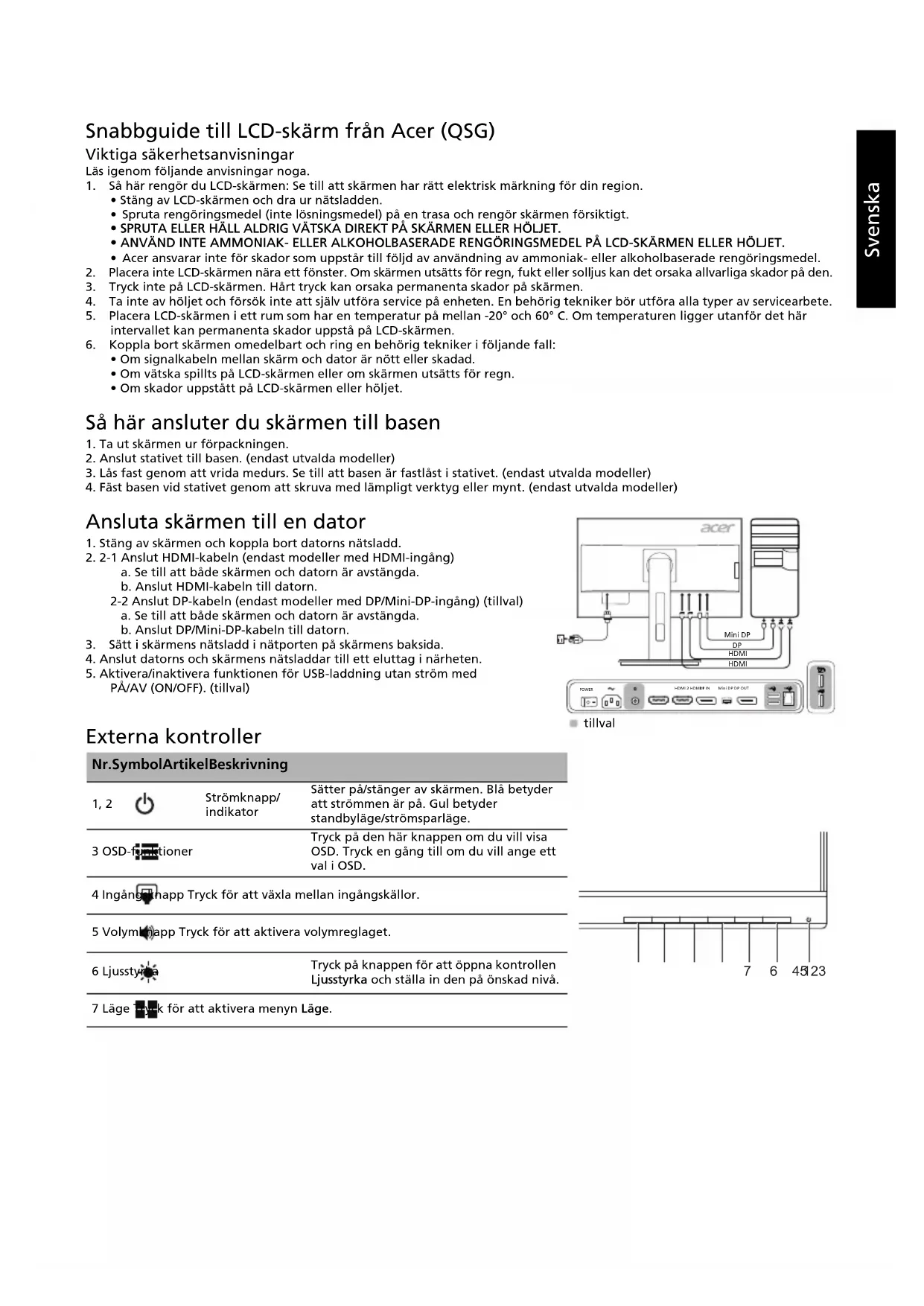 Технические характеристики зависят от модели и/или региона.Svenska Snabbguide till LCD-skärm från Acer (QSG) Viktiga säkerhetsanvisningar Läs igenom följande anvisningar noga.