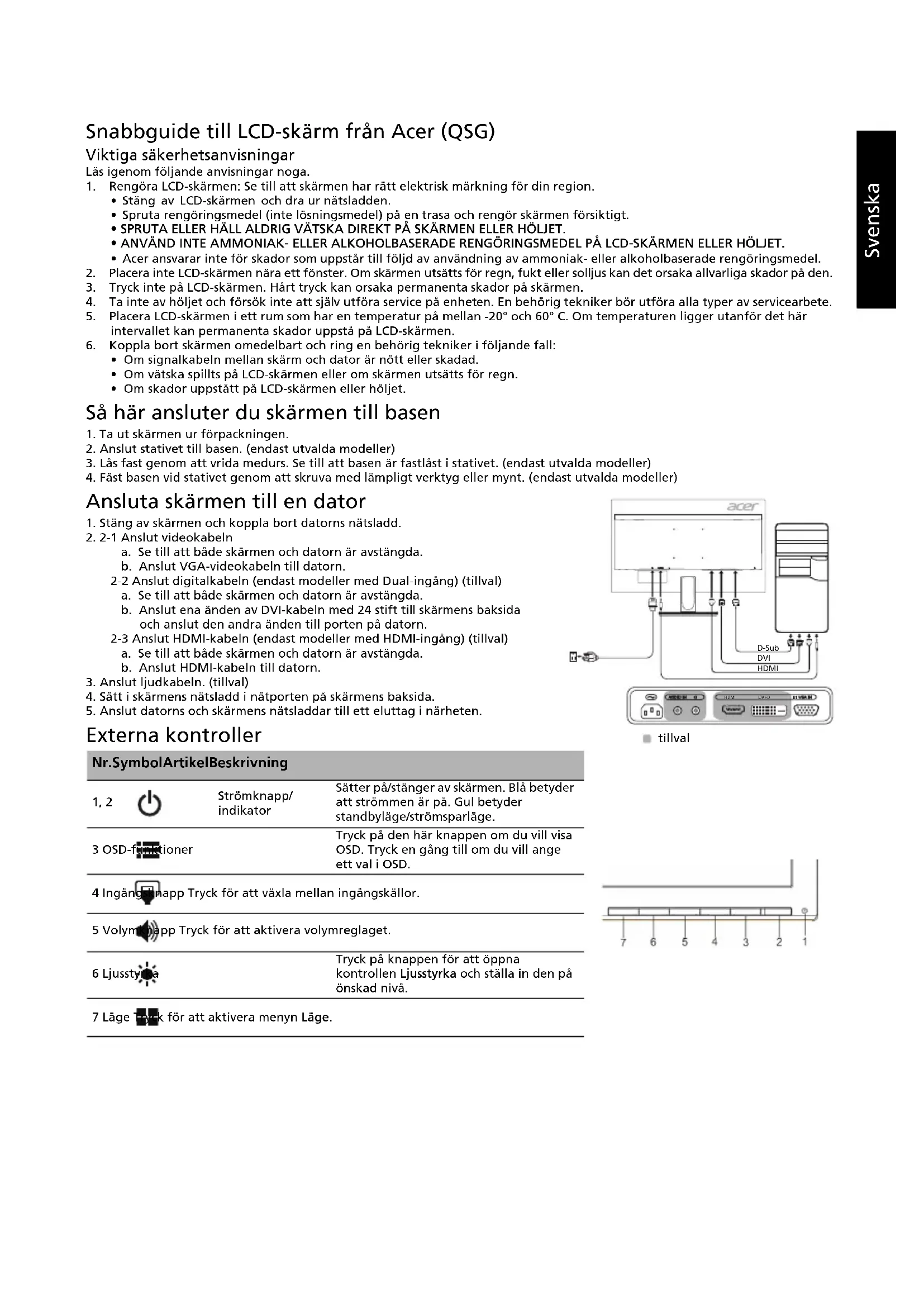På-läge 21 W (typiskt) Viloläge 0,5 W (typiskt) Av-läge 0,35 W (typiskt) Ingångskontakt D-Sub DVI-D 24-stifts (endast modeller med Dual-ingång) (tillval) HDMI (endast modeller med HDMI-ingång) (tillval) Videosignalsingång Analog: 0,7 Vp-p (standard), 75 OHM, positiv Digital signal (endast modeller med Dual-ingång) (tillval) HDMI (endast modeller med HDMI-ingång) (tillval) Högtalare 2 W × 2 (tillval) Största skärmstorlek Horisontellt: 534,74 mm Vertikalt: 313,26 mm Strömkälla 100–240 V, 50/60 Hz Miljöfaktorer Temperatur vid drift: 0 ° till 40 °C Temperatur vid förvaring: -20 ° till 60 °C Fuktighet vid drift: 20% till 80 % Mått 539,9 (B) × 409,4 (H) × 207,4 (D) mm Vikt (netto) 3,91 kg (netto) Mekaniska specifikationer Lutning: -5° till +25° (endast vid elevationsvinkelns högsta punkt kan en bakåtlutning på 25 grader uppnås) Vridning: Nej Höjdjustering: Nej Pivotering: Nej Avtagbart fotstativ: Ja (avtagbart fotstativ med skruvkoppling) Externa kontroller Reglage/knappar Strömknapp MENY/RETUR Ingång Volym Ljusstyrka Läge Funktioner Ljusstyrka Kontrast Blått ljus ACM H-position (endast modeller med analog ingång) V-position (endast modeller med analog ingång) Fokus (endast modeller med analog ingång) Klocka (endast modeller med analog ingång) Autokonfiguration (endast modeller med analog ingång) Gamma Färgtemperatur sRGB-läge 6-axlad färgton 6-axlad färgmättnad Volym Språk OSD-timeout Ingång Automatisk källa Over Drive Tilldelning av kortkommando Vidvinkelsläge DDC/CI Snabbstartsläge Skärminformation Återställ alla inställningar Alla specifikationer kan ändras utan föregående meddelande.繁體中文 Acer LCD 顯示器快速安裝指南 (QSG)