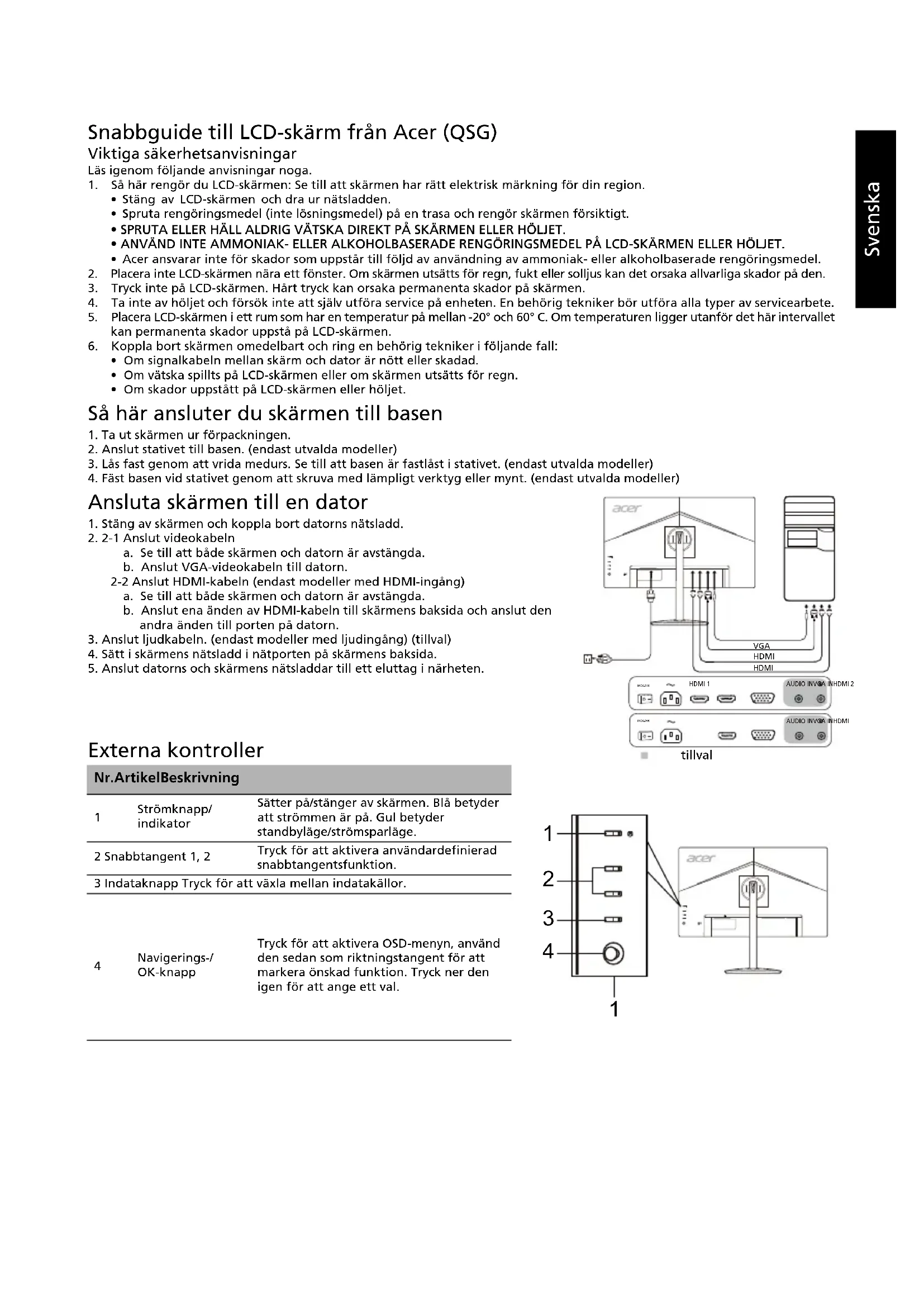 Технические характеристики зависят от модели и/или региона.Svenska Snabbguide till LCD-skärm från Acer (QSG) Viktiga säkerhetsanvisningar Läs igenom följande anvisningar noga.
