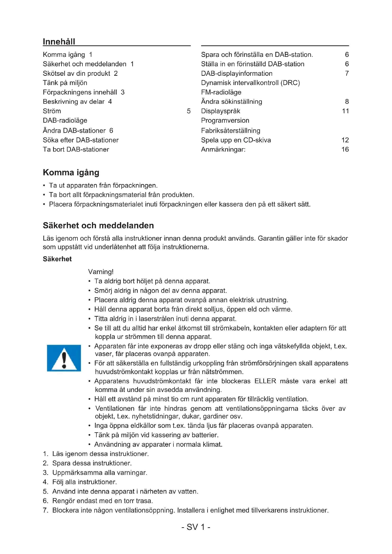 Komma igång 1 Säkerhet och meddelanden 1 Skötsel av din produkt 2 Tänk på miljön 2 Förpackningens innehåll 3 Beskrivning av delar 4 Ström 5 DAB-radioläge 5 Ändra DAB-stationer 6 Söka efter DAB-stationer 6 Ta bort DAB-stationer 6 Spara och förinställa en DAB-station. 6 Ställa in en förinställd DAB-station 6 DAB-displayinformation 7 Dynamisk intervallkontroll (DRC) 7 FM-radioläge 7 Ändra sökinställning 8 Displayspråk 11 Programversion 11 Fabriksåterställning 11 Spela upp en CD-skiva 12 Anmärkningar: 16 Innehåll- SV 2 -
