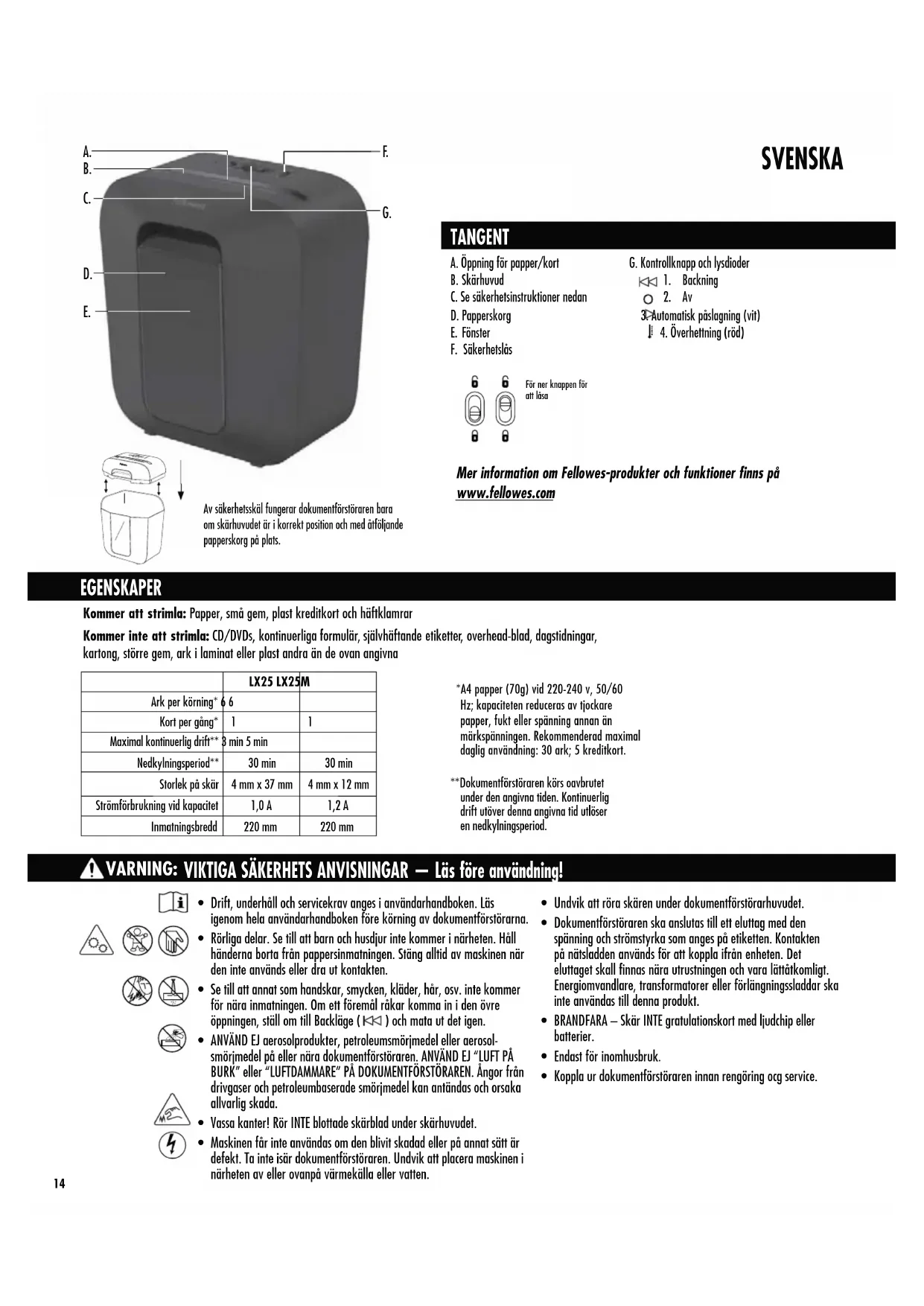 ½WFSIFUUOJOHSÚE För ner knappen för att låsaLX25 LX25MArk per körning* 6 6,PSUQFSHÌOH 11Maximal kontinuerlig drift** 3 min 5 min/FELZMOJOHTQFSJPE 30 min 30 minStorlek på skär 4 mm x 37 mm 4 mm x 12 mmStrömförbrukning vid kapacitet 1,0 A 1,2 AInmatningsbredd 220 mm 220 mm** Dokumentförstöraren körs oavbrutet VOEFSEFOBOHJWOBUJEFO,POUJOVFSMJHdrift utöver denna angivna tid utlöser en nedkylningsperiod.* A4 papper (70g) vid 220-240 v, 50/60 )[LBQBDJUFUFOSFEVDFSBTBWUKPDLBSFpapper, fukt eller spänning annan än märkspänningen. Rekommenderad maximal daglig användning: 30 ark; 5 kreditkort.Av säkerhetsskäl fungerar dokumentförstöraren bara PNTLÊSIVWVEFUÊSJLPSSFLUQPTJUJPOPDINFEÌUGÚMKBOEFpapperskorg på plats. Mer information om Fellowes-produkter och funktioner finns på www.fellowes.com