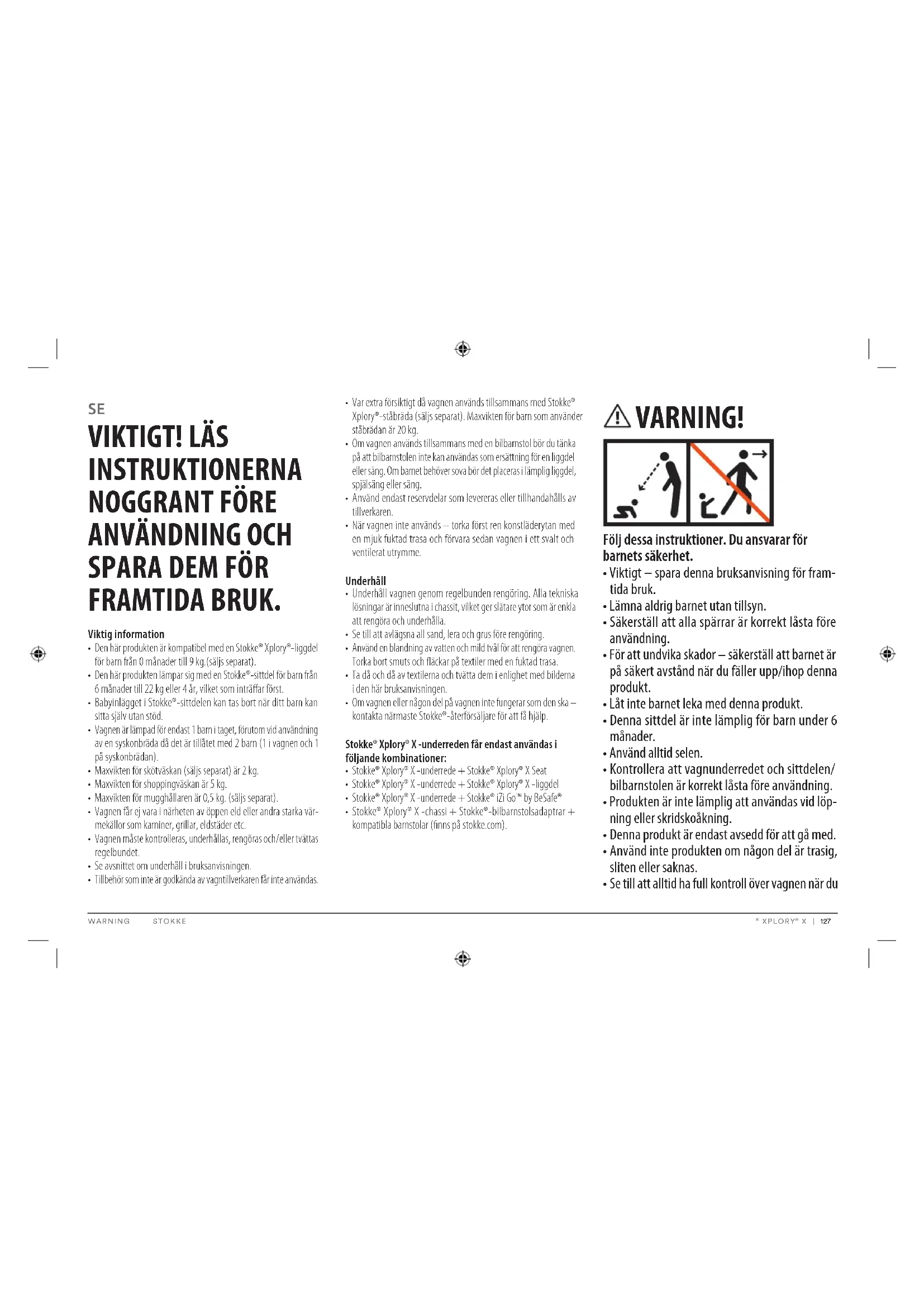 Stokke® Xplory® X -chassi + Stokke®-bilbarnstolsadaptrar + kompatibla barnstolar (nns på stokke.com). VARNING! Följ dessa instruktioner. Du ansvarar för barnets säkerhet.
