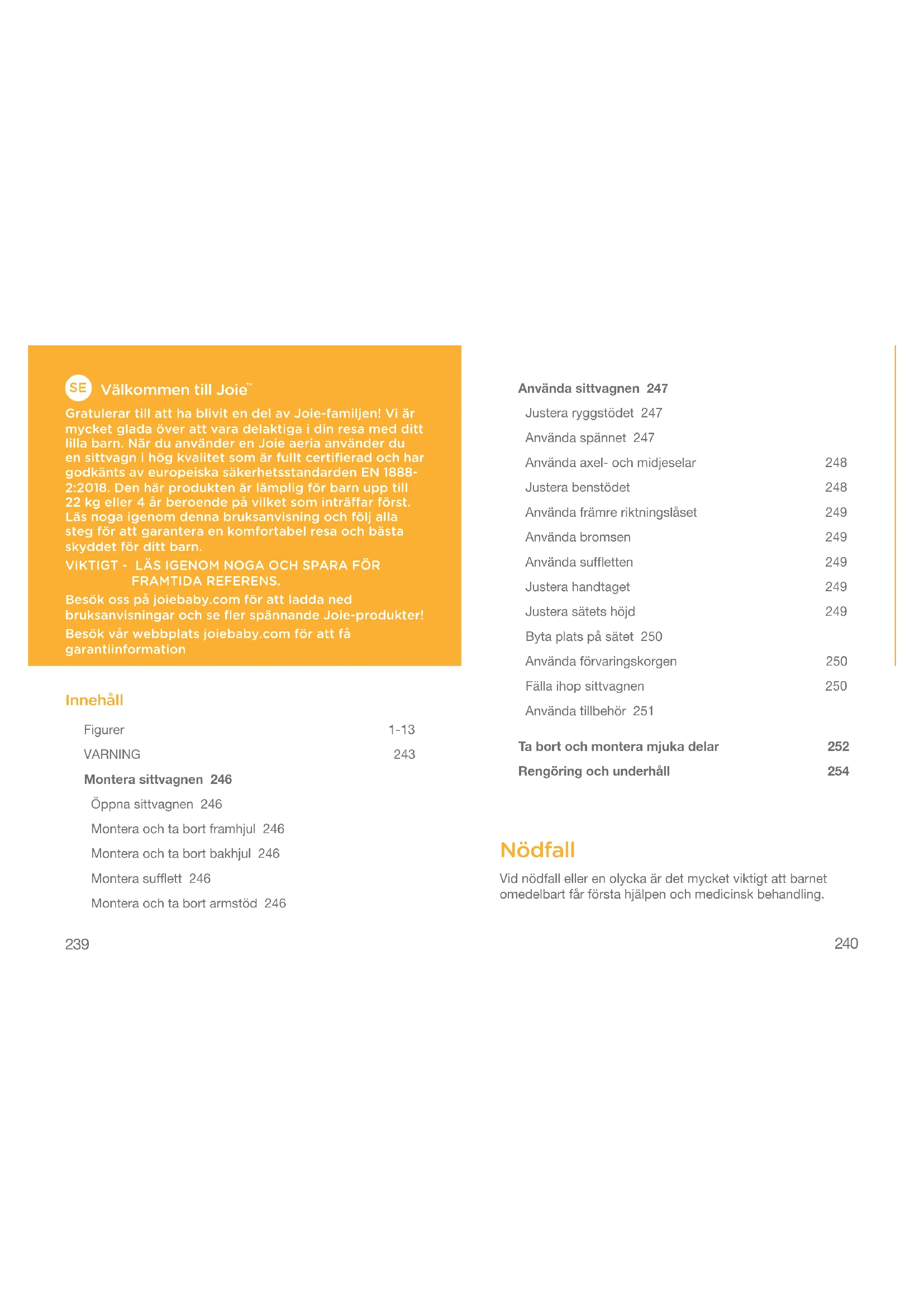 Gratulerar till att ha blivit en del av Joie-familjen! Vi är mycket glada över att vara delaktiga i din resa med ditt lilla barn. När du använder en Joie aeria använder du en sittvagn i hög kvalitet som är fullt certifierad och har godkänts av europeiska säkerhetsstandarden EN 1888- 2:2018. Den här produkten är lämplig för barn upp till 22kg eller 4år beroende på vilket som inträffar först. Läs noga igenom denna bruksanvisning och följ alla steg för att garantera en komfortabel resa och bästa skyddet för ditt barn. VIKTIGT - LÄS IGENOM NOGA OCH SPARA FÖR FRAMTIDA REFERENS. Besök oss på joiebaby.com för att ladda ned bruksanvisningar och se fler spännande Joie-produkter! Besök vår webbplats joiebaby.com för att få garantiinformation Innehåll Figurer 1-13 VARNING 243 Montera sittvagnen 246 Öppna sittvagnen 246 Montera och ta bort framhjul 246 Montera och ta bort bakhjul 246 Montera sufflett 246 Montera och ta bort armstöd 246 Använda sittvagnen 247 Justera ryggstödet 247 Använda spännet 247 Använda axel- och midjeselar 248 Justera benstödet 248 Använda främre riktningslåset 249 Använda bromsen 249 Använda suffletten 249 Justera handtaget 249 Justera sätets höjd 249 Byta plats på sätet 250 Använda förvaringskorgen 250 Fälla ihop sittvagnen 250 Använda tillbehör 251 Ta bort och montera mjuka delar 252 Rengöring och underhåll 254 Nödfall Vid nödfall eller en olycka är det mycket viktigt att barnet omedelbart får första hjälpen och medicinsk behandling.241