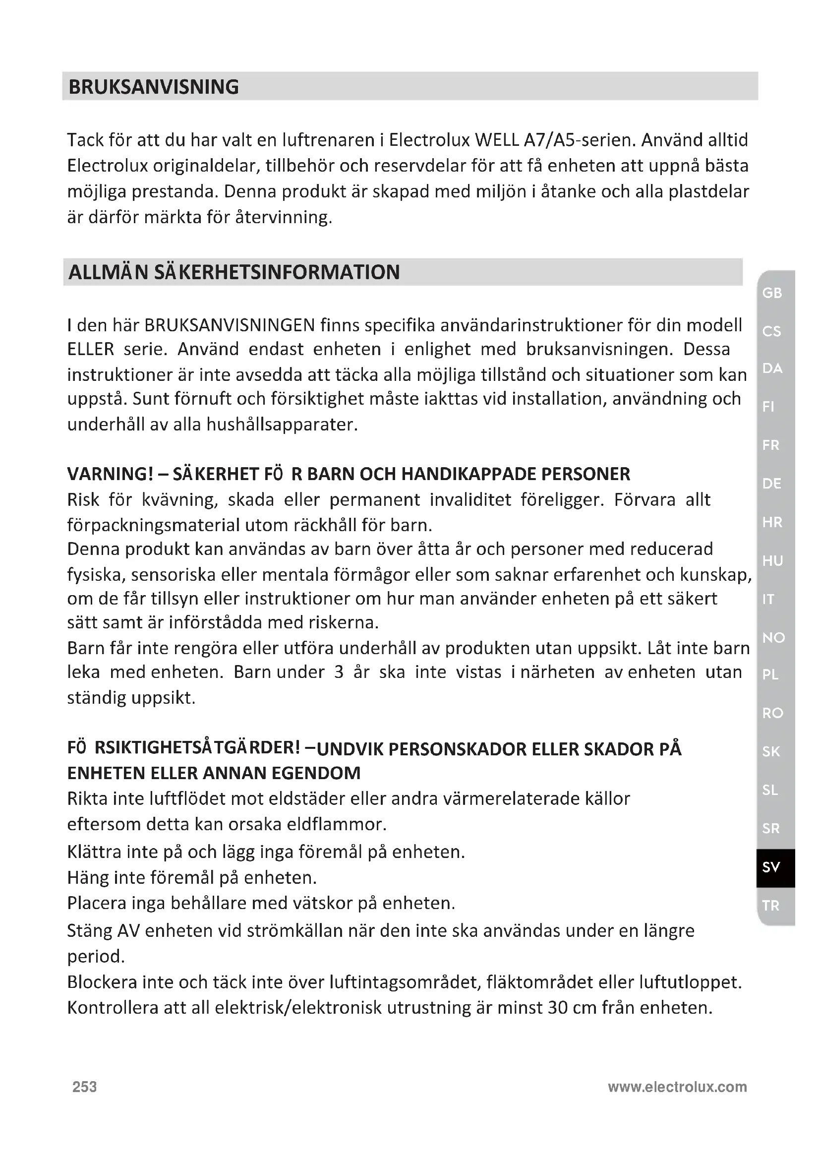 Tack för att du har valt en luftrenaren i Electrolux WELL A7/A5-serien. Använd alltid Electrolux originaldelar, tillbehör och reservdelar för att få enheten att uppnå bästa möjliga prestanda. Denna produkt är skapad med miljön i åtanke och alla plastdelar är därför märkta för återvinning.