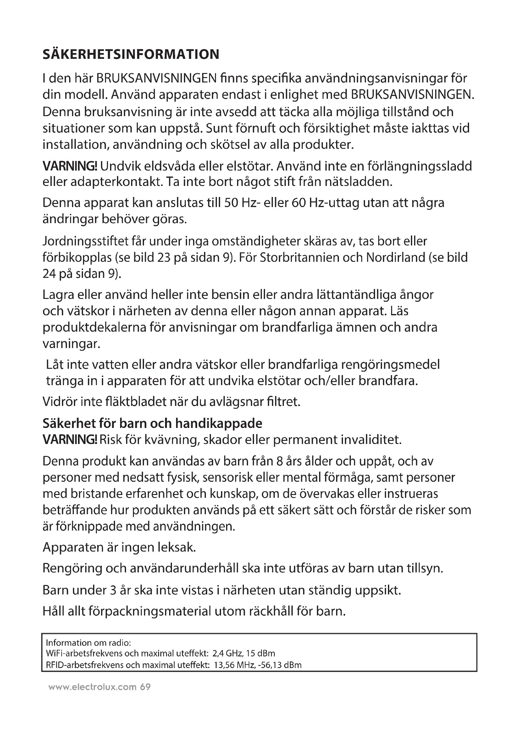 CSwww.electrolux.com 69 SÄKERHETSINFORMATION I den här BRUKSANVISNINGEN nns specika användningsanvisningar för din modell. Använd apparaten endast i enlighet med BRUKSANVISNINGEN. Denna bruksanvisning är inte avsedd att täcka alla möjliga tillstånd och situationer som kan uppstå. Sunt förnuft och försiktighet måste iakttas vid installation, användning och skötsel av alla produkter. VARNING! Undvik eldsvåda eller elstötar. Använd inte en förlängningssladd eller adapterkontakt. Ta inte bort något stift från nätsladden. Denna apparat kan anslutas till 50 Hz- eller 60 Hz-uttag utan att några ändringar behöver göras. Jordningsstiftet får under inga omständigheter skäras av, tas bort eller förbikopplas (se bild 23 på sidan 9). För Storbritannien och Nordirland (se bild 24 på sidan 9). Lagra eller använd heller inte bensin eller andra lättantändliga ångor och vätskor i närheten av denna eller någon annan apparat. Läs produktdekalerna för anvisningar om brandfarliga ämnen och andra varningar. Låt inte vatten eller andra vätskor eller brandfarliga rengöringsmedel tränga in i apparaten för att undvika elstötar och/eller brandfara. Vidrör inte äktbladet när du avlägsnar ltret. Säkerhet för barn och handikappade VARNING! Risk för kvävning, skador eller permanent invaliditet. Denna produkt kan användas av barn från 8 års ålder och uppåt, och av personer med nedsatt fysisk, sensorisk eller mental förmåga, samt personer med bristande erfarenhet och kunskap, om de övervakas eller instrueras beträande hur produkten används på ett säkert sätt och förstår de risker som är förknippade med användningen. Apparaten är ingen leksak. Rengöring och användarunderhåll ska inte utföras av barn utan tillsyn. Barn under 3 år ska inte vistas i närheten utan ständig uppsikt. Håll allt förpackningsmaterial utom räckhåll för barn. Information om radio: WiFi-arbetsfrekvens och maximal uteffekt: 2,4 GHz, 15 dBm RFID-arbetsfrekvens och maximal uteffekt: 13,56 MHz, -56,13 dBmwww.electrolux.com70 Elektrisk information VARNING! Undvik eldsvåda eller elstötar. Om du inte vet om vägguttaget är ordentligt jordat eller skyddat av en trög säkring eller kretsbrytare ska en behörig elektriker installera korrekt uttag enligt nationella elinstallationsnormer och gällande lokala regler och förordningar. Använd inte en förlängningssladd eller adapterkontakt. Koppla aldrig ur enheten genom att dra i nätsladden. Ta alltid ett fast grepp om kontakten och dra rakt ut från vägguttaget. Kläm, böj eller knyt inte nätsladden. Skär inte i eller skada nätsladden. Om nätsladden är skadad får den bara bytas ut av en auktoriserad Electrolux-servicetekniker. Apparaten innehåller inga delar som användaren kan utföra service på. Kontakta alltid en av Electrolux auktoriserad serviceverkstad för reparationer. Om sladden är skadad måste den bytas ut av tillverkaren eller dennes serviceagent, eller av annan kvalicerad person för att undvika fara. Du måste koppla från enheten före rengöring för att förhindra elstötar eller brand. Säkerhetsföreskrifter FÖRSIKTIGT! Undvik allvarliga personskador eller dödsfall. Stick inte in och sätt inte ngrar eller föremål i luftöppningarna eller frontgallret på enheten. Slå inte på eller av enheten genom att dra ut nätsladden eller stänga av strömmen i kopplingsdosan. Vid fel (gnistor, bränd lukt osv.) ska du sluta använda produkten direkt, dra ut nätsladden och ringa en av Electrolux auktoriserad serviceverkstad. Använd inte produkten när du är våt om händerna. Dra inte i nätsladden. FÖRSIKTIGT! Undvik skador på enheten eller annan egendom. Rikta inte luftödet mot eldstäder eller andra värmerelaterade källor eftersom detta kan orsaka att elden ammar upp. Klättra inte på och ställ inte föremål på enheten. Häng inte föremål från enheten. Placera inga vätskebehållare på enheten. Stäng av enheten vid vägguttaget när den inte ska användas under en längre tid. Använd enheten med ett luftlter på plats. Blockera inte och täck inte över intagsgallret, utloppsdelen och utloppsportarna. Kontrollera att all annan elektrisk/elektronisk utrustning är placerad på 30 cm avstånd från enheten. KASSERING Den här symbolen på produkten eller på förpackningen indikerar att produkten inte får behandlas som hushållsavfall. För att återvinna produkten ska du ta den till en miljöstation eller till ett Electrolux servicecenter som kan ta bort och återvinna batteriet och elektriska delar på ett säkert och professionellt sätt. Följ gällande bestämmelser för separat insamling av elektriska produkter och uppladdningsbara batterier. SVENSKA Tack för att du väljer Electrolux luftrenare PURE A9-40/PURE A9-60. Använd alltid originaltillbehör och reservdelar för att få bästa resultat. Denna produkt är utformad med miljön i åtanke. Alla plastdelar är markerade föråtervinningssyften.
