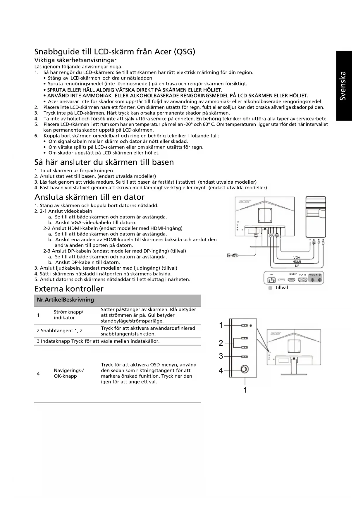 Технические характеристики зависят от модели и/или региона.Svenska Snabbguide till LCD-skärm från Acer (QSG) Viktiga säkerhetsanvisningar Läs igenom följande anvisningar noga.