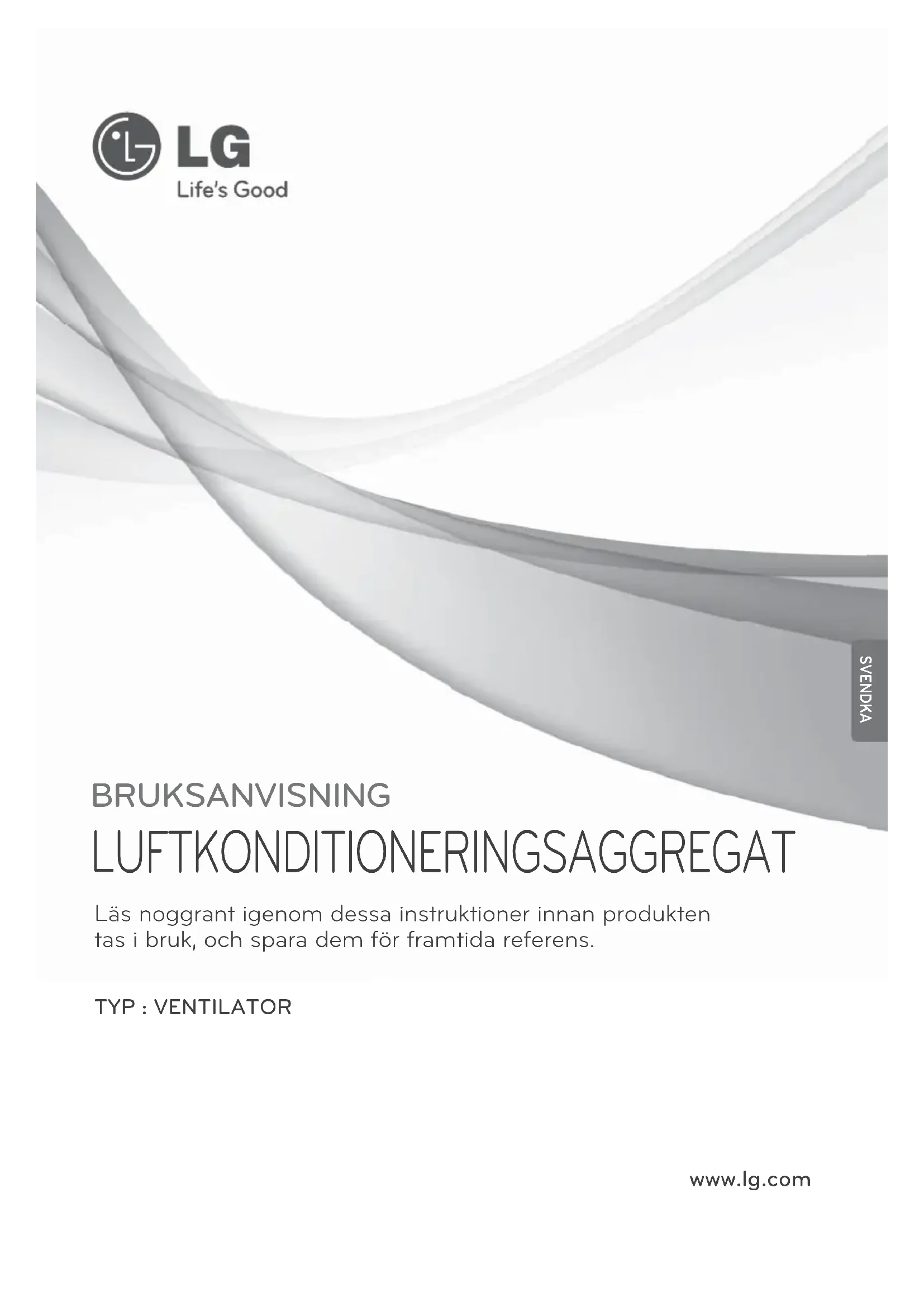 Fixera locket på höger gångjärn samt på väns- ter sida. (En namnplatta sitter fäst i läsriktning- en). VARNING: Slå av nätspänningen vid underhåll eller rengöring av enheten. IAKTTA FÖRSIKTIGHET: Bär hands- kar i samband med allt underhållsar- bete. SVENDKA22 Fläkt Kontrollera objekt före felanmälan Kontrollera objekt före felanmälan Produkten fungerar ej Produkten fungerar ej när knappen "ON" trycks you press the 'ON' switch Även om du ändrar fläkthastig- heten ändras inte driftläget och den ändras till "Auto eller låg" Finns strömtillförsel? Har luftfilter eller komplett vär- meväxlare täppts igen? Understiger inomhustempera- turen -10°C eller överstiger den 45°C? Understiger inomhustempera- turen -10°C eller överstiger den 45°C? Strömförsörjning Följ rengörings- och utbytes- metod. Det är ett viloläge för att skyd- da den kompletta värmeväxla- ren. Det är ett driftläge för att skyd- da den totala värmeväxlaren. Symptom Kontrollera Motåtgärdwww.lg.com BRUKSANVISNING KLIMAANLEGG Vennligst les denne bruksanvisningen før betjening av ditt apparat og ta vare på den for fremtidig referanse. MODELL : VENTILATOR NORSK2 Ventilator Bruksanvisning INNHOLDSFORTEGNELSE