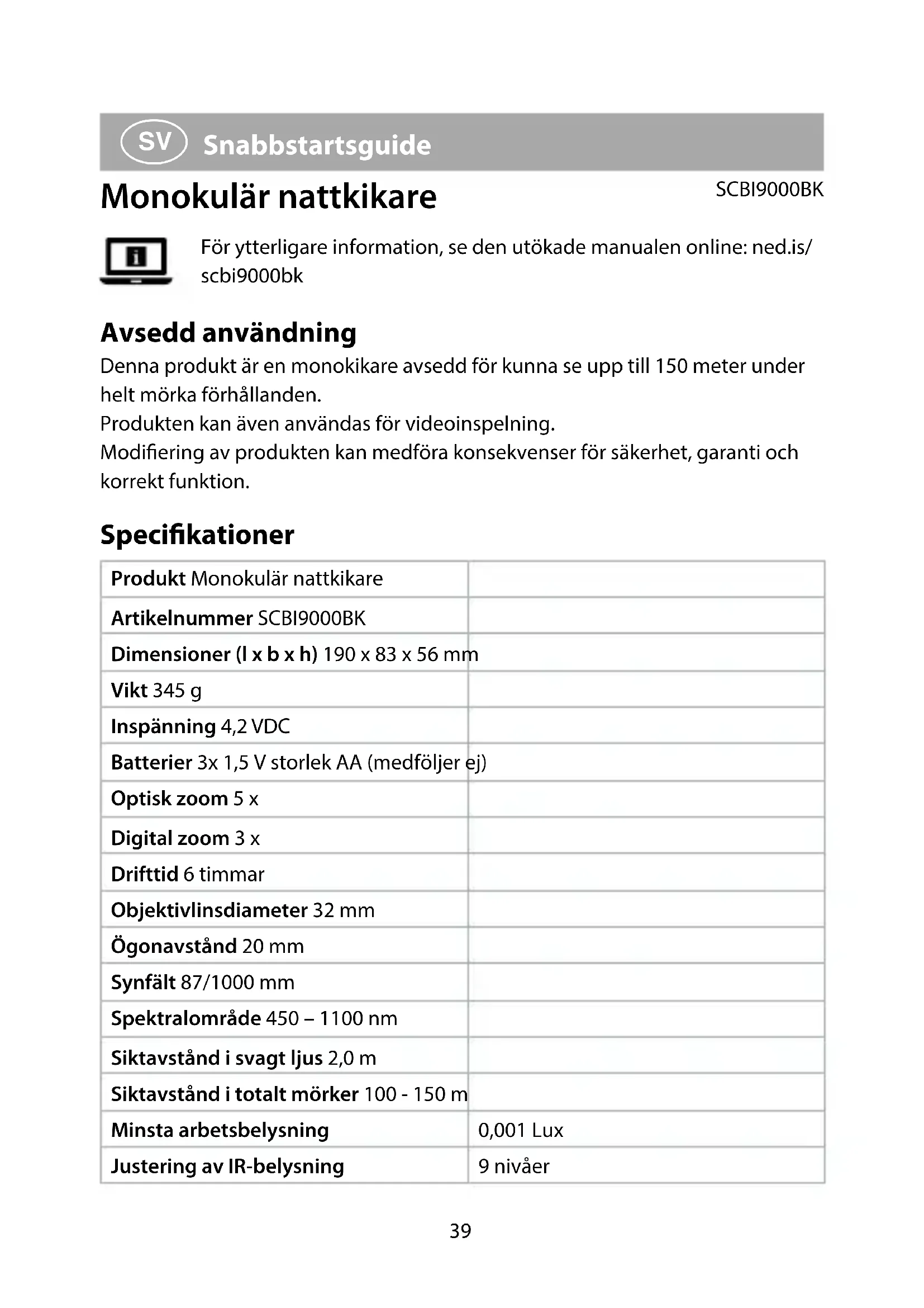 Snabbstartsguide Monokulär nattkikare SCBI9000BK För ytterligare information, se den utökade manualen online: ned.is/ scbi9000bk Avsedd användning Denna produkt är en monokikare avsedd för kunna se upp till 150 meter under helt mörka förhållanden. Produkten kan även användas för videoinspelning. Modiering av produkten kan medföra konsekvenser för säkerhet, garanti och korrekt funktion. Specikationer Produkt Monokulär nattkikare Artikelnummer SCBI9000BK Dimensioner (l x b x h) 190 x 83 x 56 mm Vikt 345 g Inspänning 4,2 VDC Batterier 3x 1,5 V storlek AA (medföljer ej) Optisk zoom 5 x Digital zoom 3 x Drifttid 6 timmar Objektivlinsdiameter 32 mm Ögonavstånd 20 mm Synfält 87/1000 mm Spektralområde 450 – 1100 nm Siktavstånd i svagt ljus 2,0 m Siktavstånd i totalt mörker 100 - 150 m Minsta arbetsbelysning 0,001 Lux Justering av IR-belysning 9 nivåer40 Fokuslängd 57 mm Videoupplösning 640 x 480 pixlar Bildupplösning 0.3 MP Micro-SD-kort 4 - 32 GB (Klass 10) (ingår inte) Anslutningar Mini USB, 3,5 mm AV-utgång Huvuddelar (bild A) 1 Objektivets linsskydd 2 Fokusring 3 Handledsrem 4 Ned-knapp 5 Upp-knapp 6 Lägesknapp 7 Kraftknapp 8 Dioptrivärde 9 Okularlins q Dioptriring w Hjälpbelysning e Picatinnyskena r Stativfattning t Mini USB-port y Videoöverföringsport u Fack för micro SD-kort i Batterilock Symboler (bild B) 1 Batteriindikator 2 Indikator för kameraläge 3 Tillgänglig lagring för bilder och video 4 Micro-SD-kortindikator Säkerhetsanvisningar