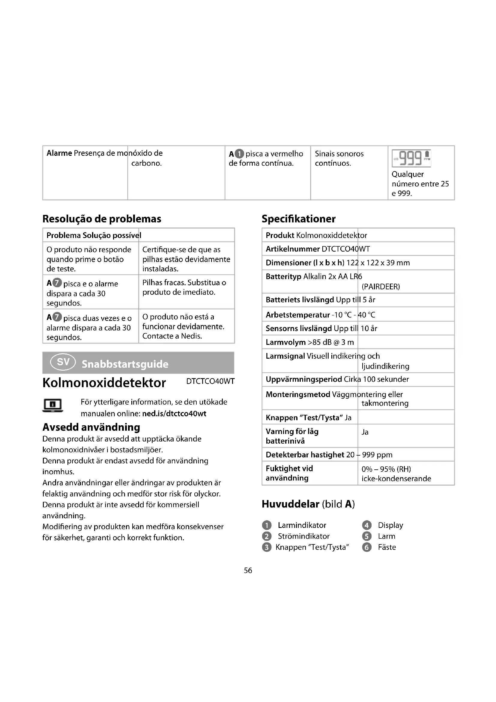 Snabbstartsguide Kolmonoxiddetektor DTCTCO40WT För ytterligare information, se den utökade manualen online: ned.is/dtctco40wt Avsedd användning Denna produkt är avsedd att upptäcka ökande kolmonoxidnivåer i bostadsmiljöer. Denna produkt är endast avsedd för användning inomhus. Andra användningar eller ändringar av produkten är felaktig användning och medför stor risk för olyckor. Denna produkt är inte avsedd för kommersiell användning. Modiering av produkten kan medföra konsekvenser för säkerhet, garanti och korrekt funktion. Specikationer Produkt Kolmonoxiddetektor Artikelnummer DTCTCO40WT Dimensioner (l x b x h) 122 x 122 x 39 mm Batterityp Alkalin 2x AA LR6 (PAIRDEER) Batteriets livslängd Upp till 5 år Arbetstemperatur -10 °C - 40 °C Sensorns livslängd Upp till 10 år Larmvolym >85 dB @ 3 m Larmsignal Visuell indikering och ljudindikering Uppvärmningsperiod Cirka 100 sekunder Monteringsmetod Väggmontering eller takmontering Knappen ”Test/Tysta” Ja Varning för låg batterinivå