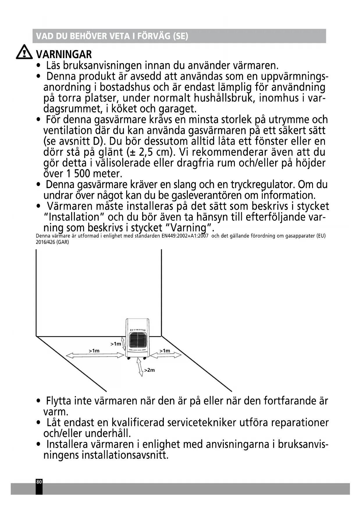 - Värmaren måste installeras på det sätt som beskrivs i stycket “Installation” och du bör även ta hänsyn till efterföljande var- ning som beskrivs i stycket ”Varning”. Denna värmare är utformad i enlighet med standarden EN449:2002+A1:2007 och det gällande förordning om gasapparater (EU) 2016/426 (GAR)
