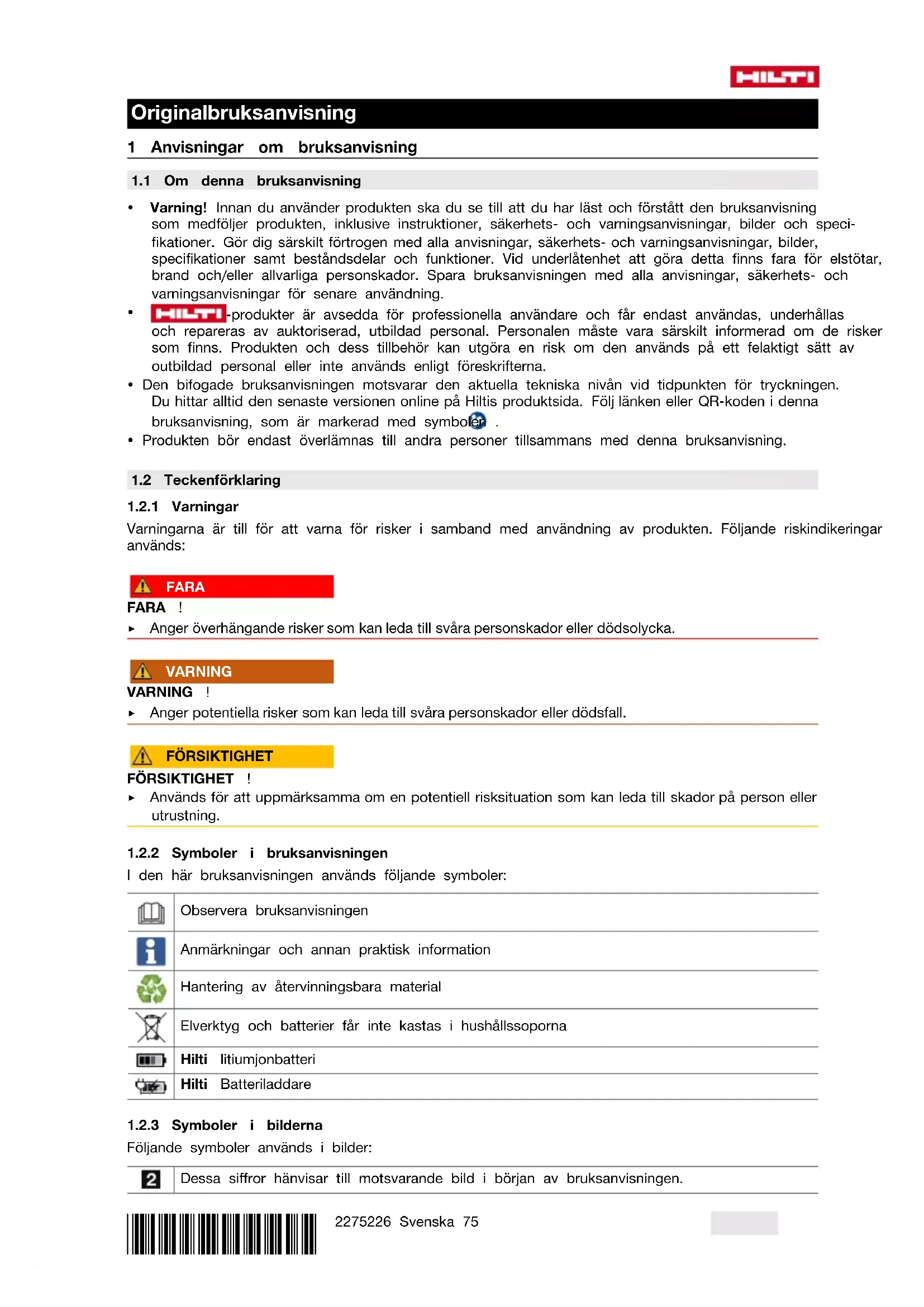 11 Tillverkargaranti ▶ Vänd dig till din lokala Hilti-representant om du har frågor om garantivillkoren. 12 Ytterligare information 13 Hilti-litiumjonbatterier Anvisningar för säkerhet och användning I denna dokumentation används begreppet batteri för Hiltis uppladdningsbara litiumjonbatterier där flera litiumjonceller har slagits samman. De är avsedda för Hiltis elverktyg och får endast användas till dessa. Använd endast originalbatterier från Hilti!82 Svenska 2275226 *2275226* Beskrivning Hilti-batterier är utrustade med cellhanterings- och cellskyddssystem. Batterierna består av celler som innehåller lagringsmaterial av litiumjoner, vilka möjliggör en hög specificerad energitäthet. Litiumjoncellerna utsätts för en väldigt liten minneseffekt, men reagerar kraftigt på ovarsam hantering, fullständig urladdning eller höga temperaturer. De produkter som är godkända för Hilti-batterier hittar du i din Hilti Store eller på: www.hilti.group Säkerhet ▶ Observera följande säkerhetsanvisningar för säker hantering och användning av litiumjonbatterier. Om åtgärderna inte följs kan det leda till hudirritation, svåra frätskador, kemiska brännskador, bränder och/eller explosioner. ▶ Hantera batterierna varsamt för att undvika skador och läckage av hälsovådliga syror! ▶ Batterier får absolut inte modifieras eller manipuleras! ▶ Batterier får inte tas isär, klämmas, hettas upp över 80 °C eller brännas. ▶ Använd inte och ladda inte batterier som har utsatts för slag eller på annat sätt är skadade. Kontrollera batterierna regelbundet för att se om de uppvisar tecken på skador. ▶ Använd aldrig återvunna eller reparerade batterier.