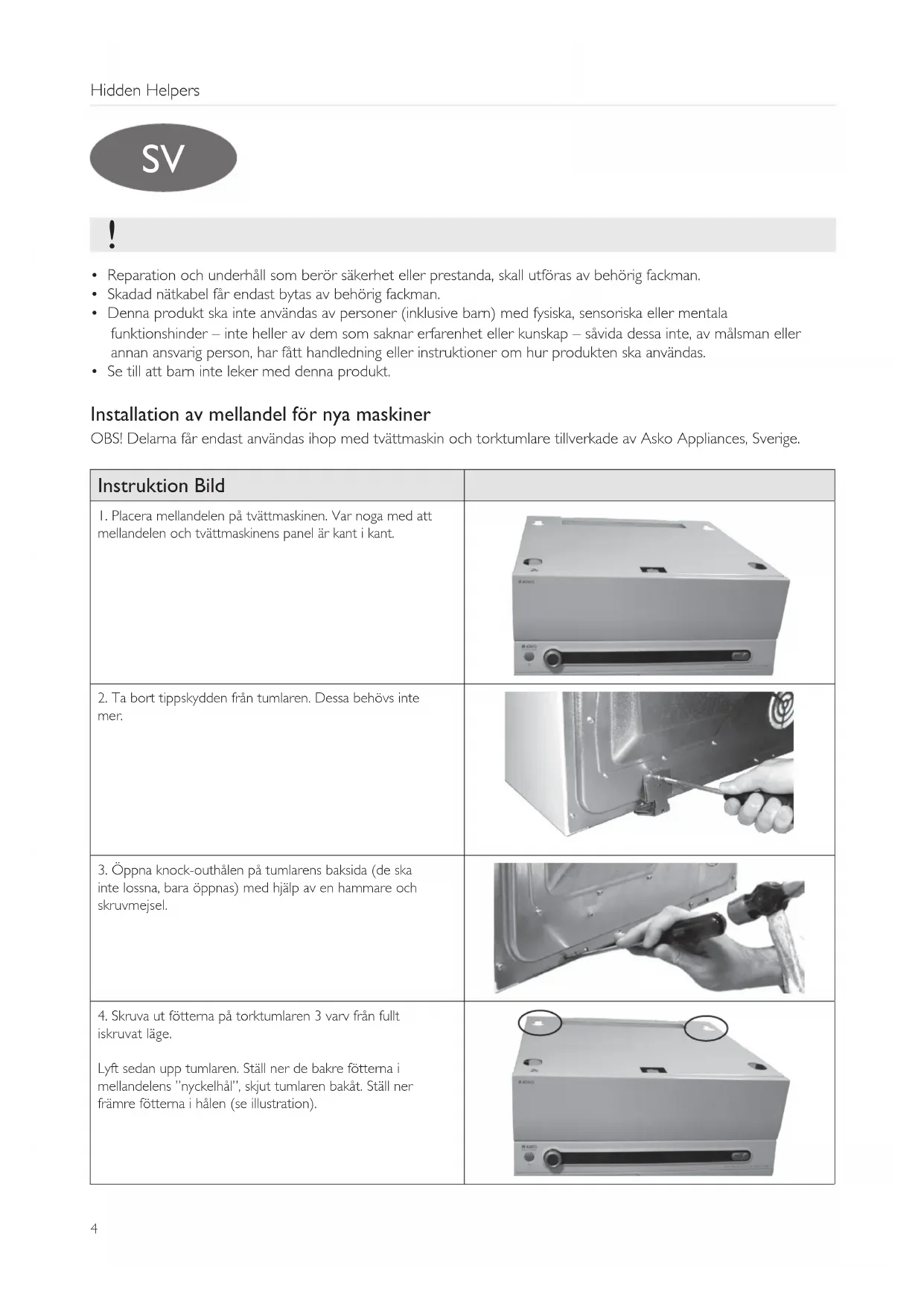 - Se till att barn inte leker med denna produkt. Installation av mellandel för nya maskiner OBS! Delarna får endast användas ihop med tvättmaskin och torktumlare tillverkade av Asko Appliances, Sverige. Instruktion Bild