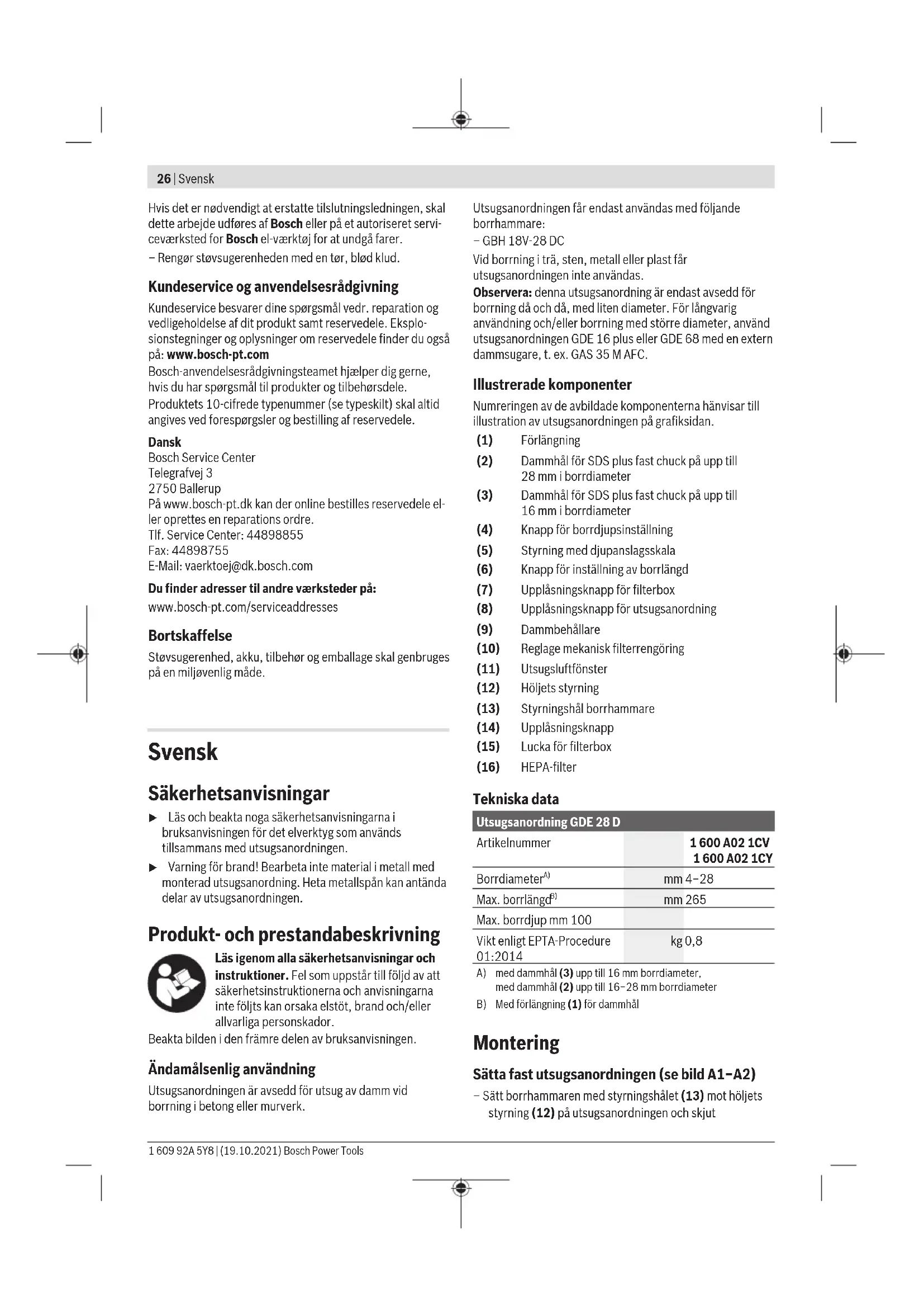 Vid borrning i trä, sten, metall eller plast får utsugsanordningen inte användas. Observera: denna utsugsanordning är endast avsedd för borrning då och då, med liten diameter. För långvarig användning och/eller borrning med större diameter, använd utsugsanordningen GDE16 plus eller GDE68 med en extern dammsugare, t.ex. GAS35MAFC. Illustrerade komponenter Numreringen av de avbildade komponenterna hänvisar till illustration av utsugsanordningen på grafiksidan. (1) Förlängning (2) Dammhål för SDS plus fast chuck på upp till 28mm i borrdiameter (3) Dammhål för SDS plus fast chuck på upp till 16mm i borrdiameter (4) Knapp för borrdjupsinställning (5) Styrning med djupanslagsskala (6) Knapp för inställning av borrlängd (7) Upplåsningsknapp för filterbox (8) Upplåsningsknapp för utsugsanordning (9) Dammbehållare (10) Reglage mekanisk filterrengöring (11) Utsugsluftfönster (12) Höljets styrning (13) Styrningshål borrhammare (14) Upplåsningsknapp (15) Lucka för filterbox (16) HEPA-filter Tekniska data Utsugsanordning GDE 28 D Artikelnummer 1 600 A02 1CV 1 600 A02 1CY Borrdiameter