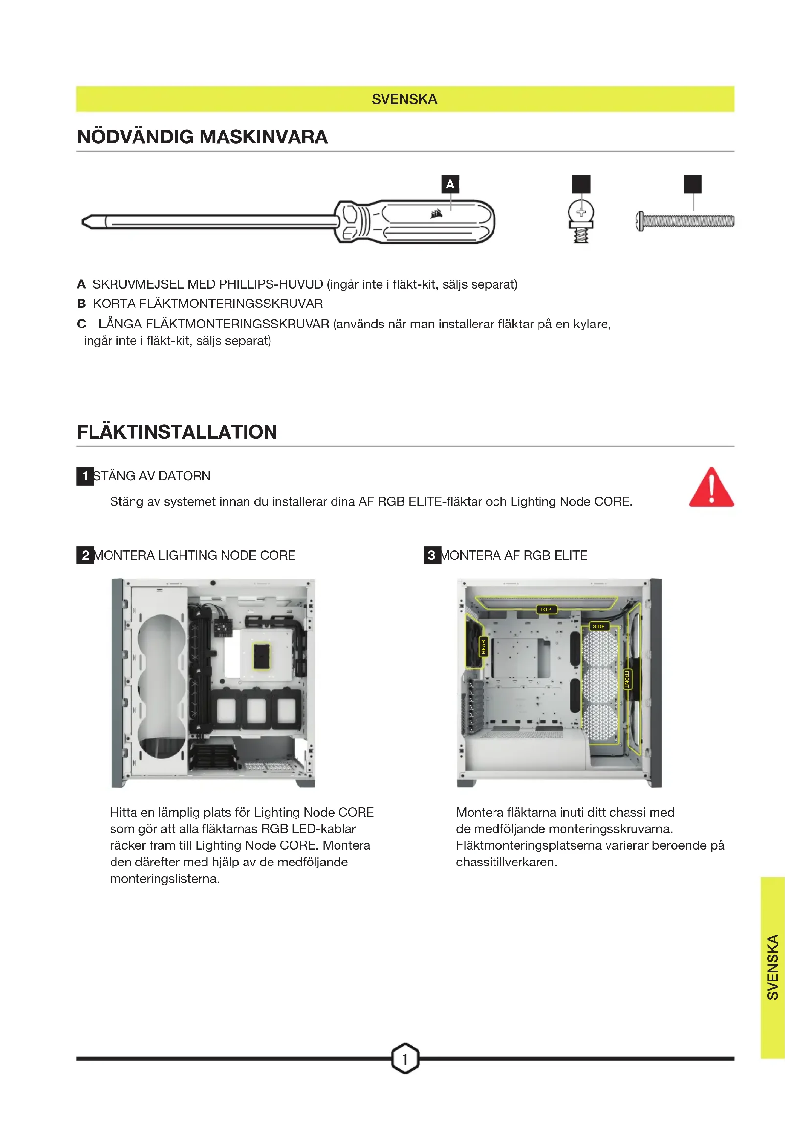 Stäng av systemet innan du installerar dina AF RGB ELITE-fläktar och Lighting Node CORE. Montera fläktarna inuti ditt chassi med de medföljande monteringsskruvarna. Fläktmonteringsplatserna varierar beroende på chassitillverkaren.