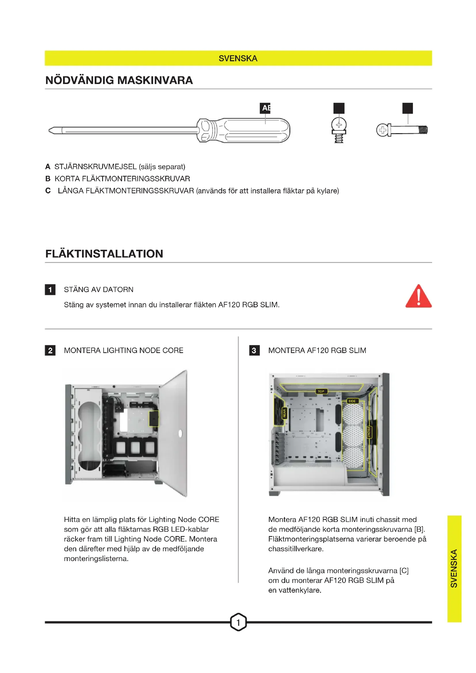 Besök vår YouTube-kanal CORSAIR LAB för fler tips och instruktioner om hur du får ut så mycket som möjligt av dina nya CORSAIR-fläktar. YTTERLIGARE RESURSER När iCUE har installerats ska du välja ”Serien med 8-LED-fläktar” i konfigurationssidan för Lighting under Lighting Node CORE. KONFIGURERA iCUE Klicka på bilden för att ladda ner CORSAIRs senaste iCUE-programvara. INSTALLERA iCUE iCUE-KONFIGURATION SVENSKA SVENSKANORSK NORSK INNHOLDSFORTEGNELSE VIFTEINSTALLASJON OPPSETT AV iCUE