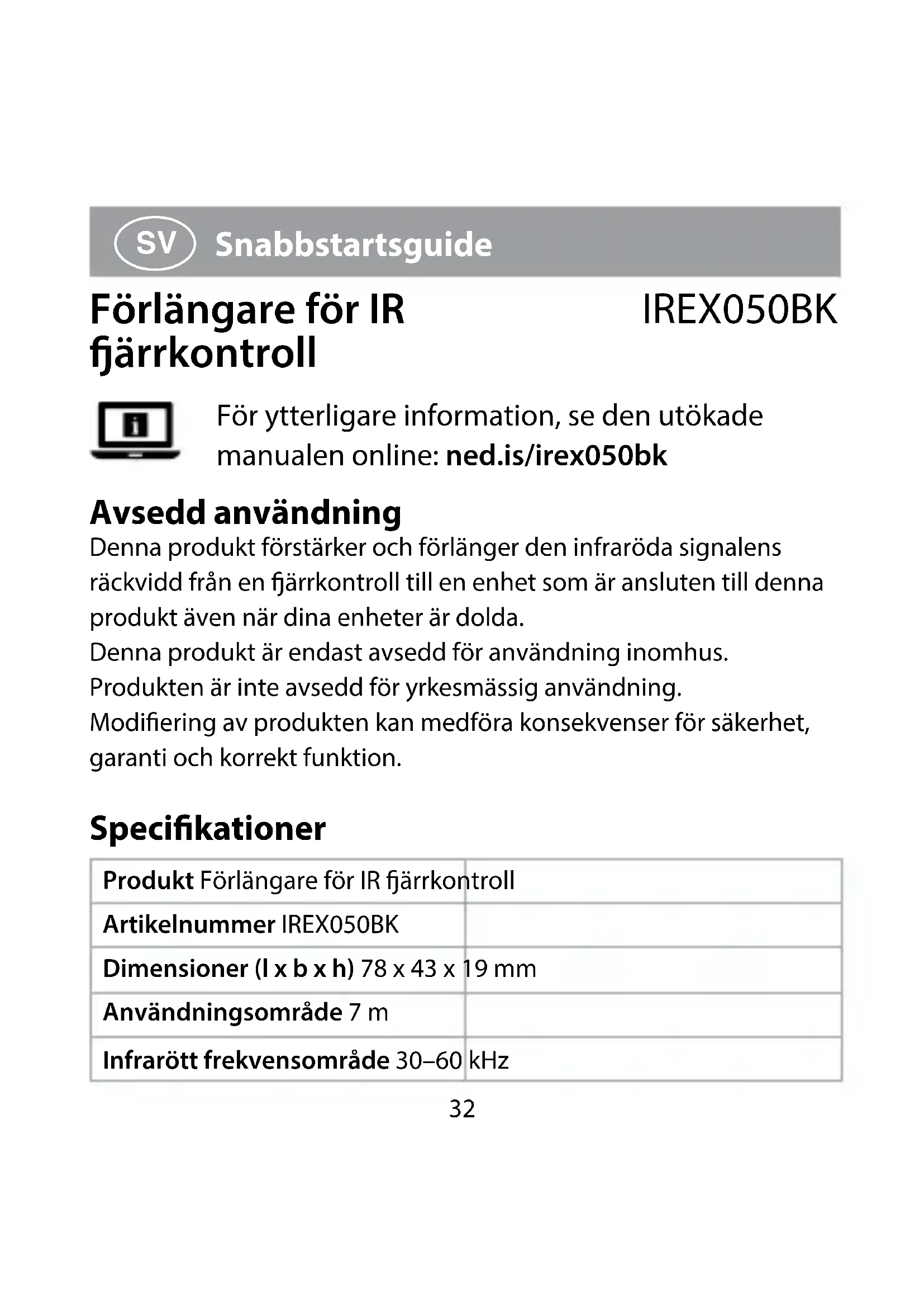 Snabbstartsguide Förlängare för IR ärrkontroll IREX050BK För ytterligare information, se den utökade manualen online: ned.is/irex050bk Avsedd användning Denna produkt förstärker och förlänger den infraröda signalens räckvidd från en ärrkontroll till en enhet som är ansluten till denna produkt även när dina enheter är dolda. Denna produkt är endast avsedd för användning inomhus. Produkten är inte avsedd för yrkesmässig användning. Modiering av produkten kan medföra konsekvenser för säkerhet, garanti och korrekt funktion. Specikationer Produkt Förlängare för IR ärrkontroll Artikelnummer IREX050BK Dimensioner (l x b x h) 78 x 43 x 19 mm Användningsområde 7 m Infrarött frekvensområde 30–60 kHz33 Förlängningssensorer 3 Y-typ LED-lampor (1, 1,5, 2 m) Inspänning 5 VDC ; 100 mA Strömförbrukning 1 W Huvuddelar (bild A)