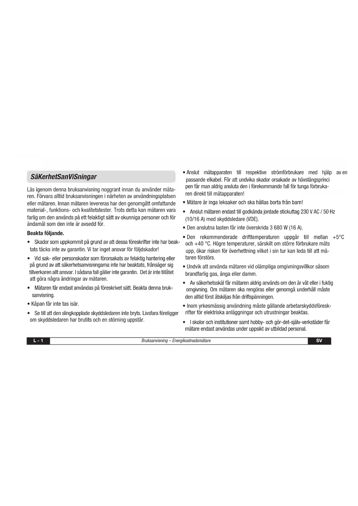 nisk udstyr – bortskaffes korrekt. Bortskaf dette produkt efter endt brugstid i henhold til gældende love. mL - 1 Bruksanvisning – Energikostnadsmätare SV SäKerhetSanViSningar Läs igenom denna bruksanvisning noggrant innan du använder mäta- ren. Förvara alltid bruksanvisningen i närheten av användningsplatsen eller mätaren. Innan mätaren levereras har den genomgått omfattande material-, funktions- och kvalitetstester. Trots detta kan mätaren vara farlig om den används på ett felaktigt sätt av okunniga personer och för ändamål som den inte är avsedd för. Beakta följande.