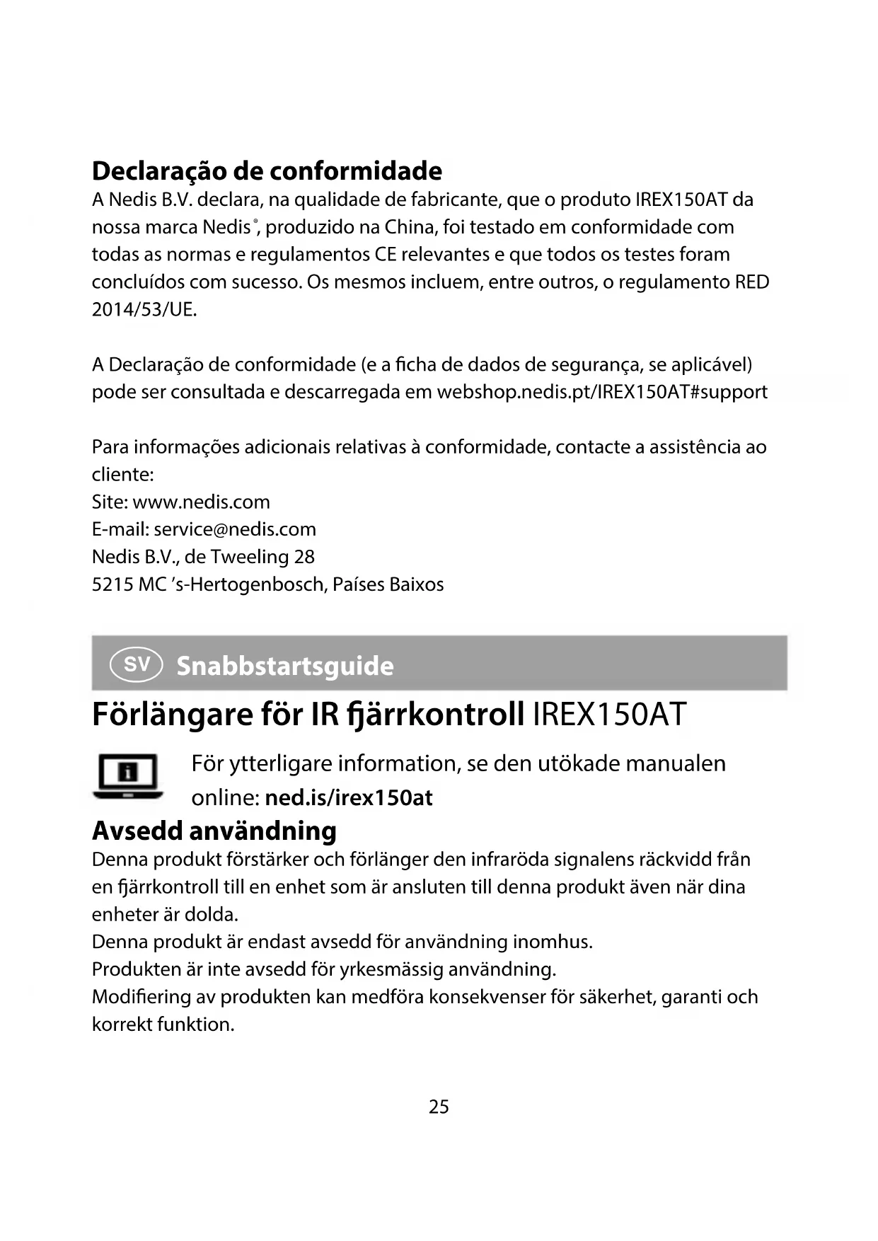 , tillverkad i Kina, har testats i enlighet med alla relevanta CE- standarder och föreskrifter och att alla tester genomförts med godkänt resultat. Detta inkluderar, men är inte begränsat till, radioutrustningsdirektivet 2014/53/ EU. Den fullständiga försäkran om överensstämmelse (och säkerhetsdatabladet, om tillämpligt) kan läsas och laddas ned från webshop.nedis.sv/IREX150AT#support För ytterligare information om överensstämmelse, var god kontakta vår kundtjänst: Webbplats: www.nedis.com E-post: service@nedis.com Nedis B.V., de Tweeling 28 5215 MC ’s-Hertogenbosch, Nederländerna