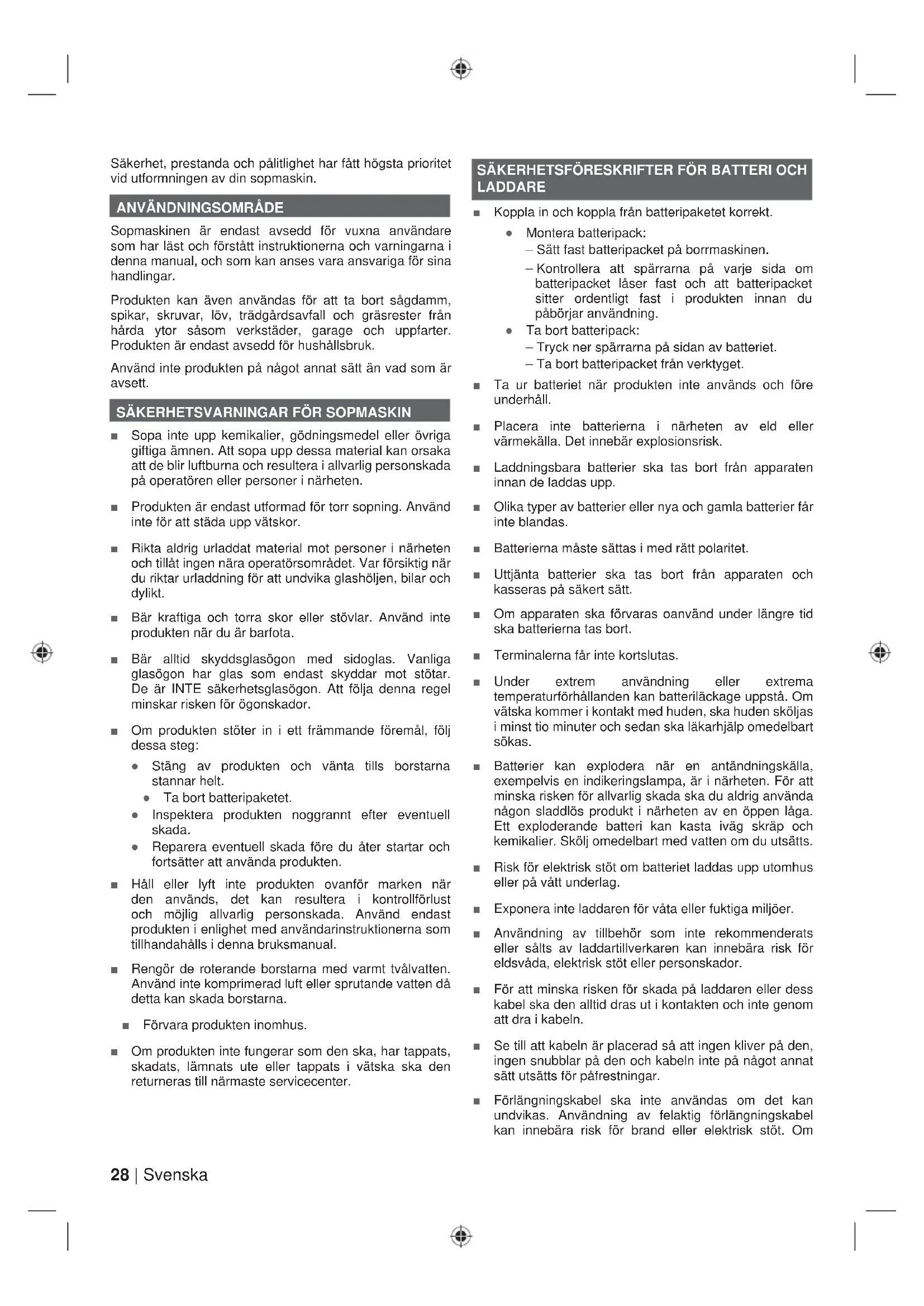 Ŷ Sopa inte upp kemikalier, gödningsmedel eller övriga giftiga ämnen. Att sopa upp dessa material kan orsaka att de blir luftburna och resultera i allvarlig personskada på operatören eller personer i närheten. Ŷ Produkten är endast utformad för torr sopning. Använd inte för att städa upp vätskor. Ŷ Rikta aldrig urladdat material mot personer i närheten och tillåt ingen nära operatörsområdet. Var försiktig när du riktar urladdning för att undvika glashöljen, bilar och dylikt. Ŷ Bär kraftiga och torra skor eller stövlar. Använd inte produkten när du är barfota. Ŷ Bär alltid skyddsglasögon med sidoglas. Vanliga glasögon har glas som endast skyddar mot stötar. De är INTE säkerhetsglasögon. Att följa denna regel minskar risken för ögonskador. Ŷ Om produkten stöter in i ett främmande föremål, följ dessa steg: Ɣ Stäng av produkten och vänta tills borstarna stannar helt. Ɣ Ta bort batteripaketet. Ɣ Inspektera produkten noggrannt efter eventuell skada. Ɣ Reparera eventuell skada före du åter startar och fortsätter att använda produkten. Ŷ Håll eller lyft inte produkten ovanför marken när den används, det kan resultera i kontrollförlust och möjlig allvarlig personskada. Använd endast produkten i enlighet med användarinstruktionerna som tillhandahålls i denna bruksmanual. Ŷ Rengör de roterande borstarna med varmt tvålvatten. Använd inte komprimerad luft eller sprutande vatten då detta kan skada borstarna. Ŷ Förvara produkten inomhus. Ŷ Om produkten inte fungerar som den ska, har tappats, skadats, lämnats ute eller tappats i vätska ska den returneras till närmaste servicecenter. SÄKERHETSFÖRESKRIFTER FÖR BATTERI OCH LADDARE Ŷ Koppla in och koppla från batteripaketet korrekt. Ɣ Montera batteripack: – Sätt fast batteripacket på borrmaskinen. – Kontrollera att spärrarna på varje sida om batteripacket låser fast och att batteripacket sitter ordentligt fast i produkten innan du påbörjar användning. Ɣ Ta bort batteripack: – Tryck ner spärrarna på sidan av batteriet. – Ta bort batteripacket från verktyget. Ŷ Ta ur batteriet när produkten inte används och före underhåll. Ŷ Placera inte batterierna i närheten av eld eller värmekälla. Det innebär explosionsrisk. Ŷ Laddningsbara batterier ska tas bort från apparaten innan de laddas upp. Ŷ Olika typer av batterier eller nya och gamla batterier får inte blandas. Ŷ Batterierna måste sättas i med rätt polaritet. Ŷ Uttjänta batterier ska tas bort från apparaten och kasseras på säkert sätt. Ŷ Om apparaten ska förvaras oanvänd under längre tid ska batterierna tas bort. Ŷ Terminalerna får inte kortslutas. Ŷ Under extrem användning eller extrema temperaturförhållanden kan batteriläckage uppstå. Om vätska kommer i kontakt med huden, ska huden sköljas i minst tio minuter och sedan ska läkarhjälp omedelbart sökas. Ŷ Batterier kan explodera när en antändningskälla, exempelvis en indikeringslampa, är i närheten. För att minska risken för allvarlig skada ska du aldrig använda någon sladdlös produkt i närheten av en öppen låga. Ett exploderande batteri kan kasta iväg skräp och kemikalier. Skölj omedelbart med vatten om du utsätts. Ŷ Risk för elektrisk stöt om batteriet laddas upp utomhus eller på vått underlag. Ŷ Exponera inte laddaren för våta eller fuktiga miljöer. Ŷ Användning av tillbehör som inte rekommenderats eller sålts av laddartillverkaren kan innebära risk för eldsvåda, elektrisk stöt eller personskador. Ŷ För att minska risken för skada på laddaren eller dess kabel ska den alltid dras ut i kontakten och inte genom att dra i kabeln. Ŷ Se till att kabeln är placerad så att ingen kliver på den, ingen snubblar på den och kabeln inte på något annat sätt utsätts för påfrestningar. Ŷ Förlängningskabel ska inte användas om det kan undvikas. Användning av felaktig förlängningskabel kan innebära risk för brand eller elektrisk stöt. Om 28 | Svenskaförlängningskabel måste användas ska du se till att: a) Stiften på kontakten på förlängningskabeln är lika många, har samma storlek och form som på laddarens kontakt. b) Förlängningskabeln är korrekt ansluten och i gott elektriskt skick. Ŷ Använd inte laddaren med skadad kontakt eller kabel. Om den skadats ska kabeln omedelbart bytas ut av godkänd tekniker. Ŷ Använd inte laddaren om den fått kraftiga slag, tappats eller på annat sätt skadats på något sätt, ta den till en godkänd tekniker. Ŷ Ta inte isär laddaren, ta den till godkänd tekniker när det är behov av underhåll eller reparation. Felaktig hopmontering kan leda till risk för brand eller elektrisk stöt. Ŷ För att minska risken för elektrisk stöt ska laddaren kopplas från uttaget före underhåll eller rengöring. Att stänga av reglagen minskar inte risken. Ŷ Koppla från laddaren från strömkälla när den inte används. Ŷ Risk för elektrisk stöt. Rör inte vid icke isolerade delar av utgången eller icke isolerad batteriterminal.