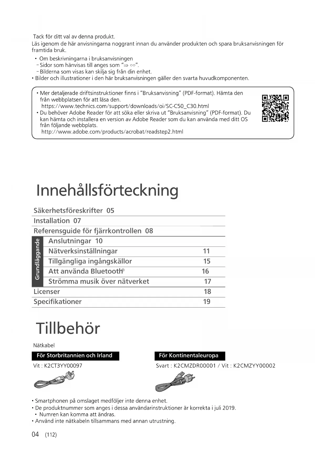 - Mer detaljerade driftsinstruktioner finns i “Bruksanvisning” (PDF-format). Hämta den från webbplatsen för att läsa den. https://www.technics.com/support/downloads/oi/SC-C50_C30.html