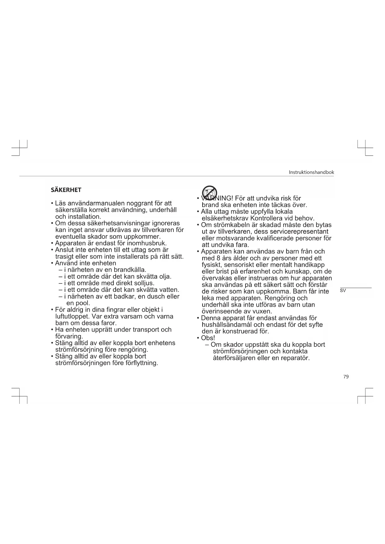 - VARNING! För att undvika risk för brand ska enheten inte täckas över.