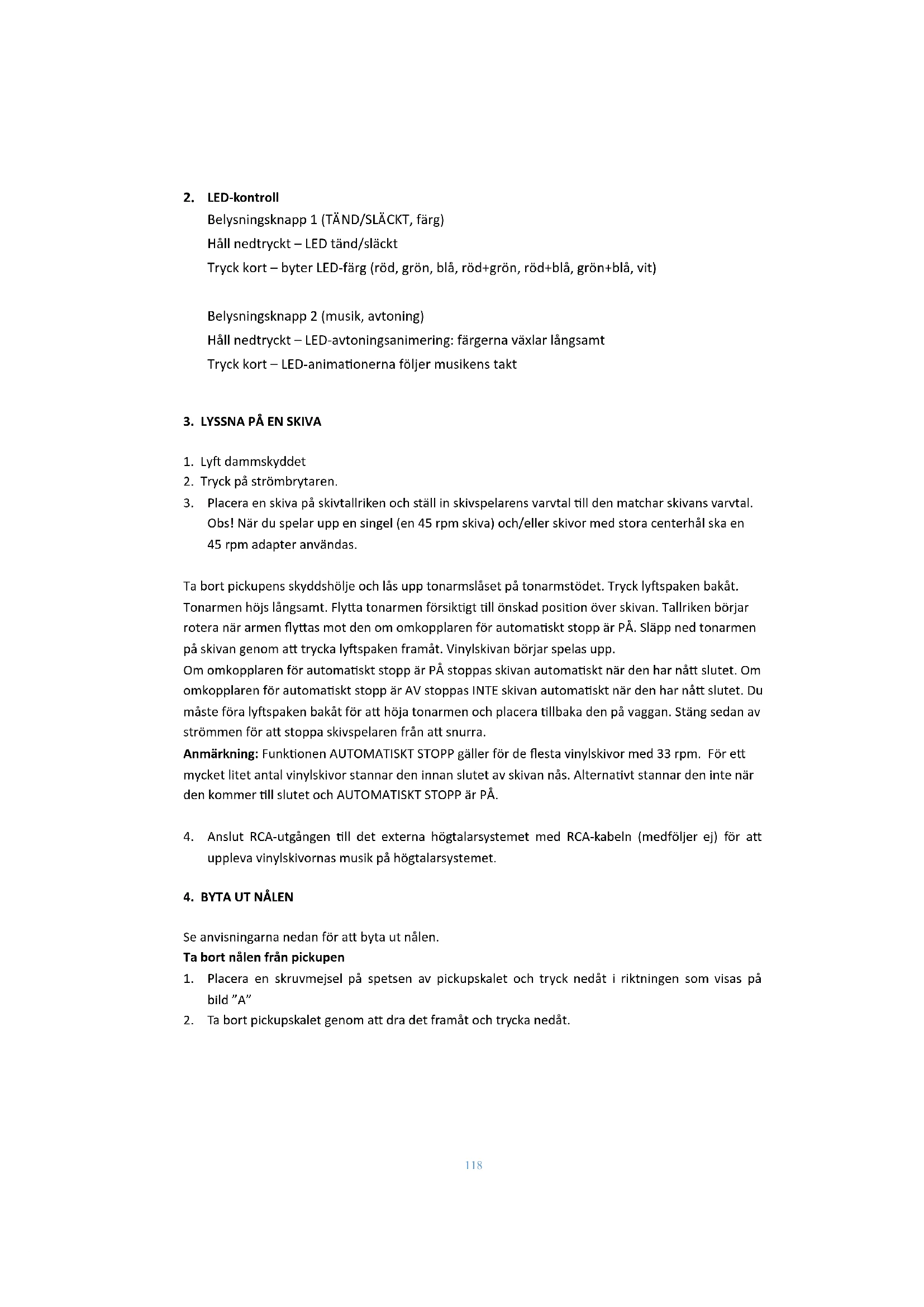 Obs! När du spelar upp en singel (en 45 rpm skiva) och/eller skivor med stora centerhål ska en 45 rpm adapter användas. Ta bort pickupens skyddshölje och lås upp tonarmslåset på tonarmstödet. Tryck lyftspaken bakåt. Tonarmen höjs långsamt. Flytta tonarmen försiktigt till önskad position över skivan. Tallriken börjar rotera när armen flyttas mot den om omkopplaren för automatiskt stopp är PÅ. Släpp ned tonarmen på skivan genom att trycka lyftspaken framåt. Vinylskivan börjar spelas upp. Om omkopplaren för automatiskt stopp är PÅ stoppas skivan automatiskt när den har nått slutet. Om omkopplaren för automatiskt stopp är AV stoppas INTE skivan automatiskt när den har nått slutet. Du måste föra lyftspaken bakåt för att höja tonarmen och placera tillbaka den på vaggan. Stäng sedan av strömmen för att stoppa skivspelaren från att snurra. Anmärkning: Funktionen AUTOMATISKT STOPP gäller för de flesta vinylskivor med 33 rpm. För ett mycket litet antal vinylskivor stannar den innan slutet av skivan nås. Alternativt stannar den inte när den kommer till slutet och AUTOMATISKT STOPP är PÅ.