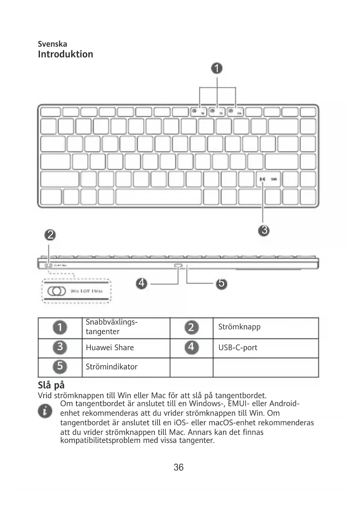 - Du kan också använda en USB-C-kabel för att ansluta tangentbordet till enheten. Växlar Tangentbordet kan parkopplas med högst tre enheter via Bluetooth. För att växla mellan enheter, tryck och håll snabbväxlings-tangenten som valdes under parkoppling intryckt. Om indikatorn blinkar och sedan lyser konstant i fem sekunder, indikerar det att växlingen lyckades. Laddning När tangentbordet används trådlöst och strömindikatorn blinkar rött, indikerar det att batterinivån är lägre än 10 %. Du kan använda en USB-C-kabel som stöder laddning för att ladda tangentbordet. Produkten levereras inte med en USB-C-kabel. Du måste köpa en USB-C- kabel separat. Mer information Besök https://consumer.huawei.com/en/support och sök genom enhetsnamn för att prova er funktioner. Säkerhetsinformation