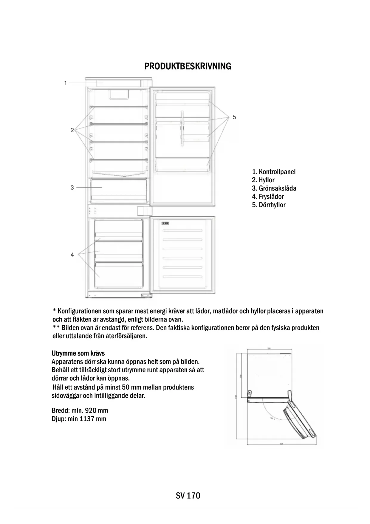 Utrymme som krävs Apparatens dörr ska kunna öppnas helt som på bilden. Behåll ett tillräckligt stort utrymme runt apparaten så att dörrar och lådor kan öppnas. Håll ett avstånd på minst 50 mm mellan produktens sidoväggar och intilliggande delar. Bredd: min. 920 mm Djup: min 1137 mmSV 171 ANVÄNDNING A. PÅ/AV-knappen används för att slå på/av apparaten B. Wi-Fi-knappen används för att slå på/av Wi-Fi C. SET-knappen används för att välja specialfunktionerna (Eko och Semester) D. TEMP-knappen används för att välja kyl- och frystemperatur a. Ikonerna för kyl/frys visar valt utrymme i apparaten b. Temperaturnivåerna visar kylskåpets valda temperatur c. Super Cool-ikonen visar om motsvarande funktion är aktiverad d. Temperaturnivåerna visar vald temperatur i frysen e. Super Cool-ikonen visar om motsvarande funktion är aktiverad f. Reglerad temperatur-ikon visar om temperaturen har valts av appen g. Ekoläge-ikonen visar om motsvarande läge är aktiverat h. Semesterfunktion-ikonen visar om motsvarande funktion är aktiverad