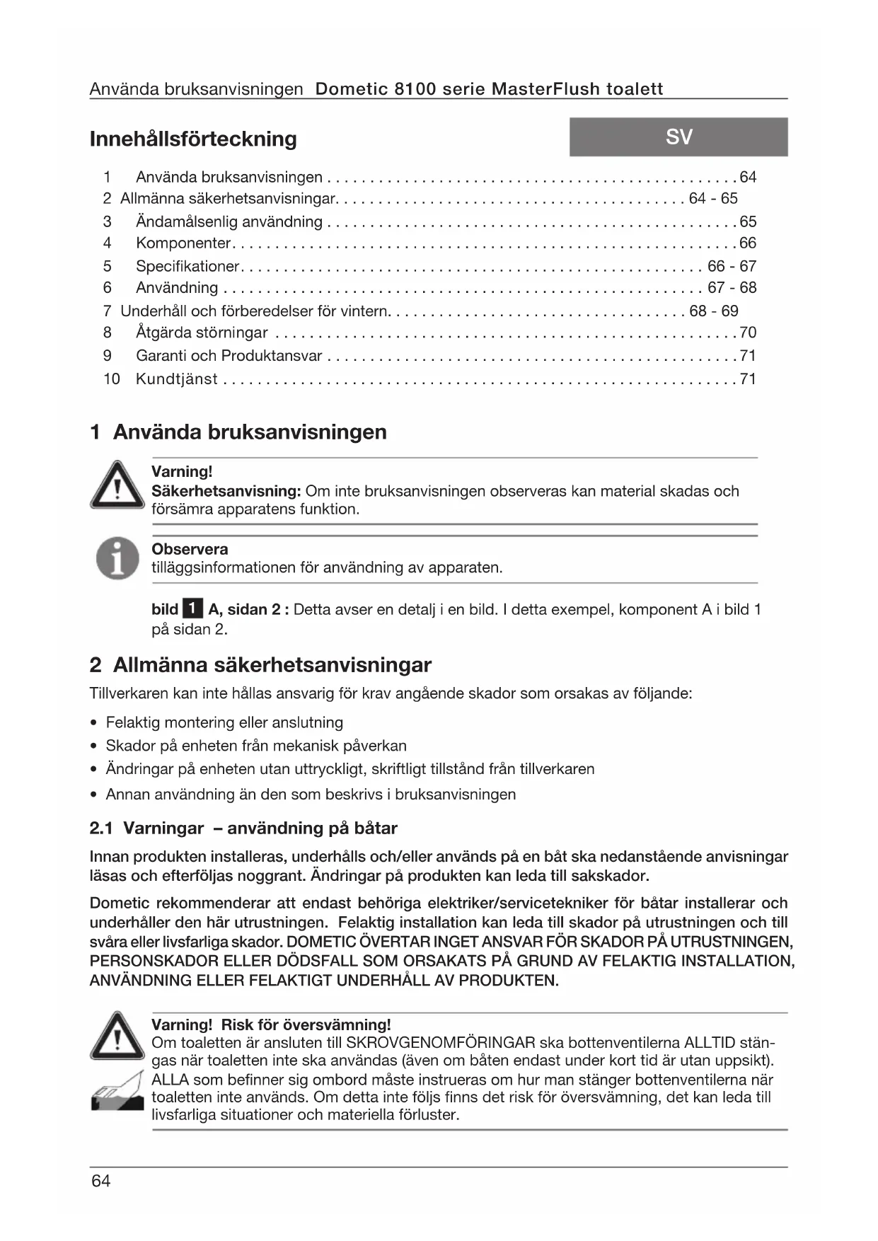 - Annan användning än den som beskrivs i bruksanvisningen Varning! Risk för översvämning! Om toaletten är ansluten till SKROVGENOMFÖRINGAR ska bottenventilerna ALLTID stän- gas när toaletten inte ska användas (även om båten endast under kort tid är utan uppsikt). ALLA som benner sig ombord måste instrueras om hur man stänger bottenventilerna när toaletten inte används. Om detta inte följs nns det risk för översvämning, det kan leda till livsfarliga situationer och materiella förluster.65 Dometic 8100 serie MasterFlush toalett Allmänna säkerhetsanvisningar Varning! Överfyllnad av avloppstanken kan orsaka allvarliga skador på sanitetssystemet; avlopp- stanken kan spricka och innehållet rinna ut i båtens slag. För att förhindra detta rekom- menderar Dometic att “full” tank”-avstängningsreläet används i toalettens kontrollmodul. “Full”-signalen från avloppstanken kan genereras av en Dometic DTM01C tankmonitor eller ett DTM04 4-stegs tankövervakningssystem. Varning! Risk för översvämning! Om färskvatten används för spolning av toaletten och den NÅGON NÅNG är direkt eller indirekt ansluten till det allmänna vattennätet på land, MÅSTE anslutningarna till vattennätet kopplas bort om båten lämnas utan uppsikt (även under kort tid utan uppsikt). Om detta inte följs nns det risk för översvämning, det kan leda till livsfarliga situationer och materiella förluster. Varning! Risk för översvämning! Innan arbetet med utrustningen påbörjas: kontrollera att strömförsörjningen har stängts av till anläggningen och att bottenventilerna är STÄNGDA resp. i AV-läget. Om detta inte följs nns det risk för översvämning, det kan leda till livsfarliga situationer och materiella förluster. 3 Ändamålsenlig användning Dometic MasterFlush toaletten i 8100-serien är en toalett med elektrisk spolning som nfördelar avfallet och pumpar ut det till en avloppstank eller ett annat avlopps-/förvaringssystem. Den styrs av en väggmonterad spolningsknapp. Det går att fylla på vatten i toalettbehållaren (före eller efter spoln- ing) och spola toaletten med en knapptryckning.