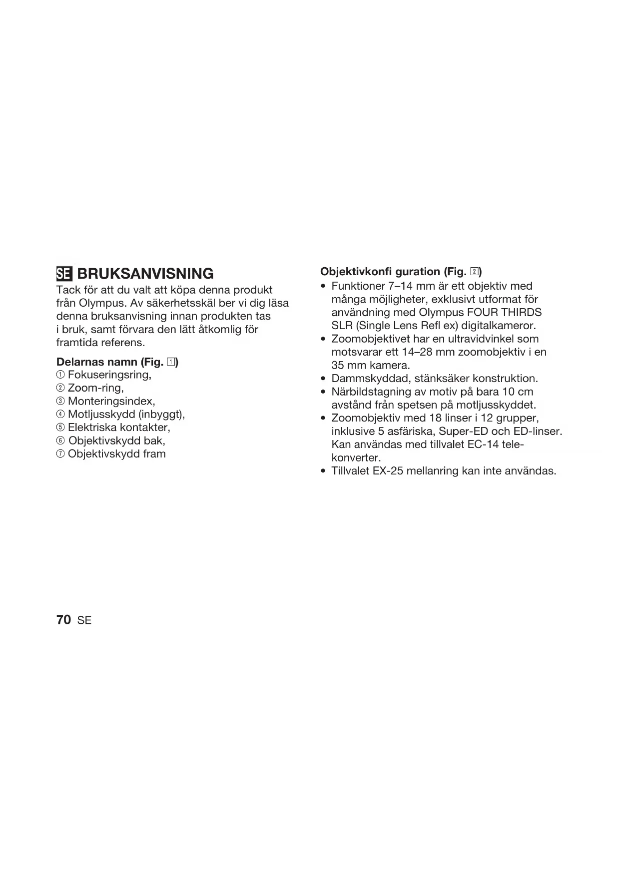 - 70 SE BRUKSANVISNING Tack för att du valt att köpa denna produkt från Olympus. Av säkerhetsskäl ber vi dig läsa denna bruksanvisning innan produkten tas i bruk, samt förvara den lätt åtkomlig för framtida referens. Delarnas namn (Fig. 1) 1 Fokuseringsring, 2 Zoom-ring, 3 Monteringsindex, 4 Motljusskydd (inbyggt), 5 Elektriska kontakter, 6 Objektivskydd bak, 7 Objektivskydd fram Objektivkonfi guration (Fig. 2) Funktioner 7–14 mm är ett objektiv med många möjligheter, exklusivt utformat för användning med Olympus FOUR THIRDS SLR (Single Lens Refl ex) digitalkameror. Zoomobjektivet har en ultravidvinkel som motsvarar ett 14–28 mm zoomobjektiv i en 35 mm kamera. Dammskyddad, stänksäker konstruktion. Närbildstagning av motiv på bara 10 cm avstånd från spetsen på motljusskyddet. Zoomobjektiv med 18 linser i 12 grupper, inklusive 5 asfäriska, Super-ED och ED-linser. Kan användas med tillvalet EC-14 tele- konverter. Tillvalet EX-25 mellanring kan inte användas.