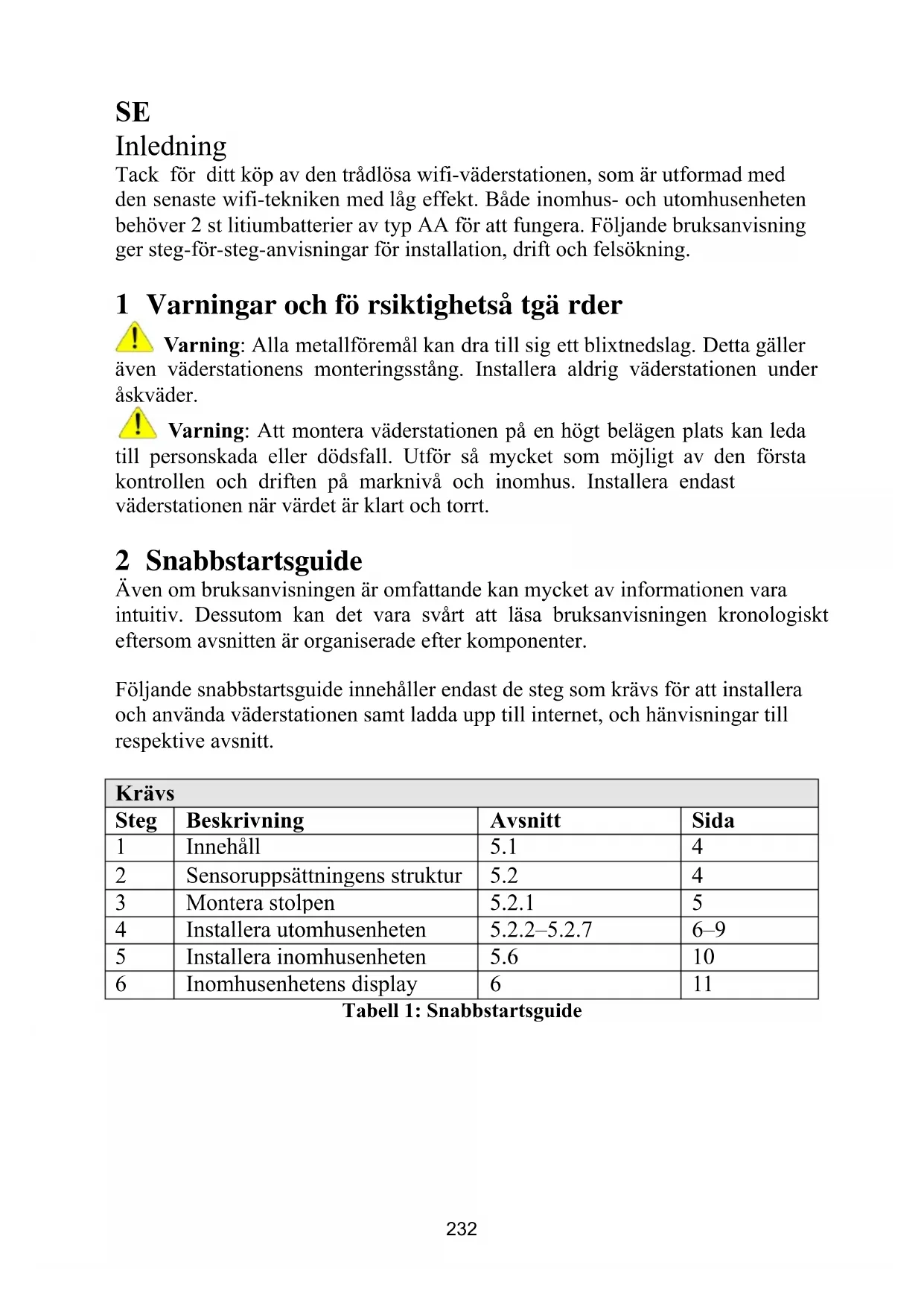 Inledning Tack för ditt köp av den trådlösa wifi-väderstationen, som är utformad med den senaste wifi-tekniken med låg effekt. Både inomhus- och utomhusenheten behöver 2 st litiumbatterier av typ AA för att fungera. Följande bruksanvisning ger steg-för-steg-anvisningar för installation, drift och felsökning. 1 Varningar och försiktighetsåtgärder Varning: Alla metallföremål kan dra till sig ett blixtnedslag. Detta gäller även väderstationens monteringsstång. Installera aldrig väderstationen under åskväder. Varning: Att montera väderstationen på en högt belägen plats kan leda till personskada eller dödsfall. Utför så mycket som möjligt av den första kontrollen och driften på marknivå och inomhus. Installera endast väderstationen när värdet är klart och torrt. 2 Snabbstartsguide Även om bruksanvisningen är omfattande kan mycket av informationen vara intuitiv. Dessutom kan det vara svårt att läsa bruksanvisningen kronologiskt eftersom avsnitten är organiserade efter komponenter. Följande snabbstartsguide innehåller endast de steg som krävs för att installera och använda väderstationen samt ladda upp till internet, och hänvisningar till respektive avsnitt. Krävs Steg Beskrivning Avsnitt Sida