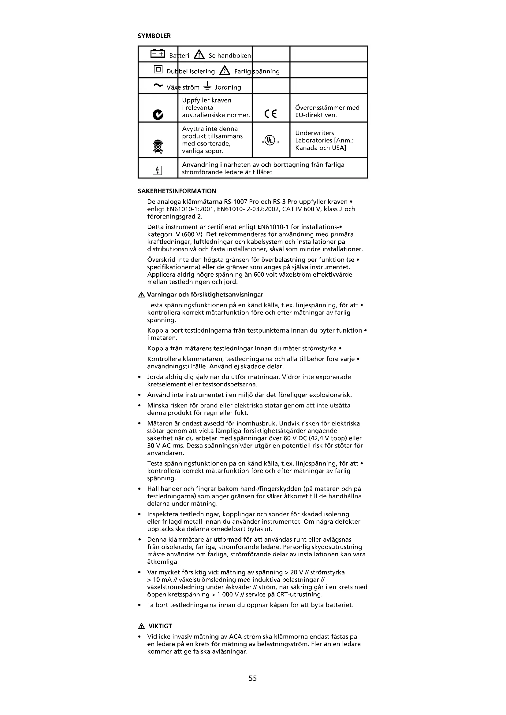 Användning i närheten av och borttagning från farliga strömförande ledare är tillåtet SÄKERHETSINFORMATION De analoga klämmätarna RS-1007 Pro och RS-3 Pro uppfyller kraven • enligt EN61010-1:2001, EN61010- 2-032:2002, CAT IV 600 V, klass 2 och föroreningsgrad 2. Detta instrument är certifierat enligt EN61010-1 för installations-• kategori IV (600 V). Det rekommenderas för användning med primära kraftledningar, luftledningar och kabelsystem och installationer på distributionsnivå och fasta installationer, såväl som mindre installationer. Överskrid inte den högsta gränsen för överbelastning per funktion (se • specifikationerna) eller de gränser som anges på själva instrumentet. Applicera aldrig högre spänning än 600 volt växelström effektivvärde mellan testledningen och jord. Varningar och försiktighetsanvisningar Testa spänningsfunktionen på en känd källa, t.ex. linjespänning, för att • kontrollera korrekt mätarfunktion före och efter mätningar av farlig spänning. Koppla bort testledningarna från testpunkterna innan du byter funktion • i mätaren. Koppla från mätarens testledningar innan du mäter strömstyrka.• Kontrollera klämmätaren, testledningarna och alla tillbehör före varje • användningstillfälle. Använd ej skadade delar. Jorda aldrig dig själv när du utför mätningar. Vidrör inte exponerade • kretselement eller testsondspetsarna. Använd inte instrumentet i en miljö där det föreligger explosionsrisk.• Minska risken för brand eller elektriska stötar genom att inte utsätta • denna produkt för regn eller fukt. Mätaren är endast avsedd för inomhusbruk. Undvik risken för elektriska • stötar genom att vidta lämpliga försiktighetsåtgärder angående säkerhet när du arbetar med spänningar över 60 V DC (42,4 V topp) eller 30 V AC rms. Dessa spänningsnivåer utgör en potentiell risk för stötar för användaren. Testa spänningsfunktionen på en känd källa, t.ex. linjespänning, för att • kontrollera korrekt mätarfunktion före och efter mätningar av farlig spänning. Håll händer och fingrar bakom hand-/fingerskydden (på mätaren och på • testledningarna) som anger gränsen för säker åtkomst till de handhållna delarna under mätning. Inspektera testledningar, kopplingar och sonder för skadad isolering • eller frilagd metall innan du använder instrumentet. Om några defekter upptäcks ska delarna omedelbart bytas ut. Denna klämmätare är utformad för att användas runt eller avlägsnas • från oisolerade, farliga, strömförande ledare. Personlig skyddsutrustning måste användas om farliga, strömförande delar av installationen kan vara åtkomliga. Var mycket försiktig vid: mätning av spänning > 20 V // strömstyrka • > 10 mA // växelströmsledning med induktiva belastningar // växelströmsledning under åskväder // ström, när säkring går i en krets med öppen kretsspänning > 1 000 V // service på CRT-utrustning. Ta bort testledningarna innan du öppnar kåpan för att byta batteriet.• VIKTIGT Vid icke invasiv mätning av ACA-ström ska klämmorna endast fästas på • en ledare på en krets för mätning av belastningsström. Fler än en ledare kommer att ge falska avläsningar.56 VIKTIGT Kontrollera att nålspärren har frigjorts innan mätningar görs.•